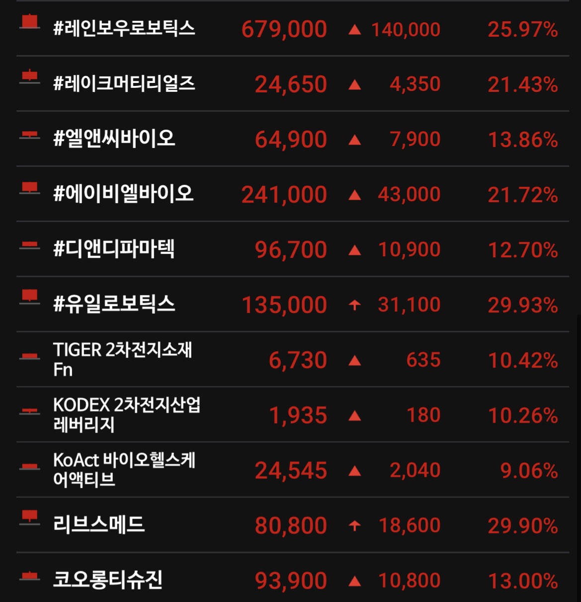 보내주신 이미지는 2026년 1월 26일 자 주식 시장의 주요 상승 종목들이군요. 오늘 시장은 로봇, 제약·바이오, 그리고 2차전지 대형주들이 강력한 랠리를 펼치며 시장을 주도한 것으로 보입니다.