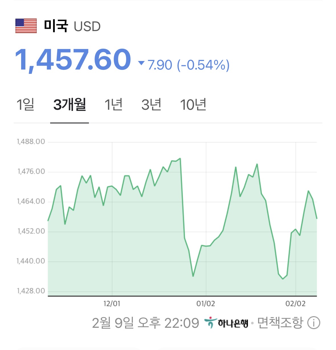 원/달러 환율은 1,457원, 전일 대비 약 7.9원 하락.