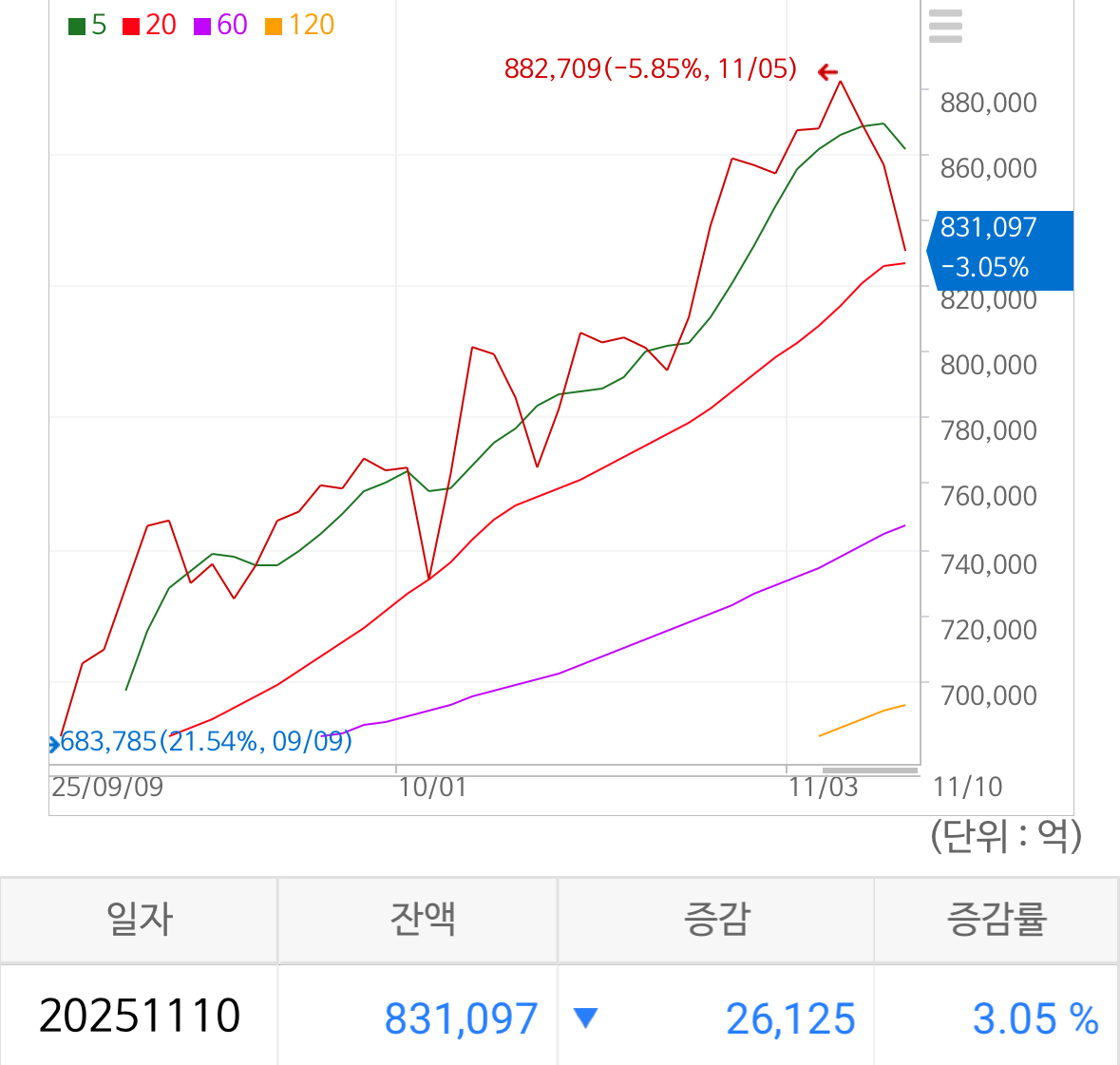 * 지난 월요일 고객예탁금은 83.1조 가량에 도착하며 3.05% 빠지는 모습. 20일선까지 성큼 내려온 상태로 증시에 대한 상승 기대가 줄어들고 있나봄.