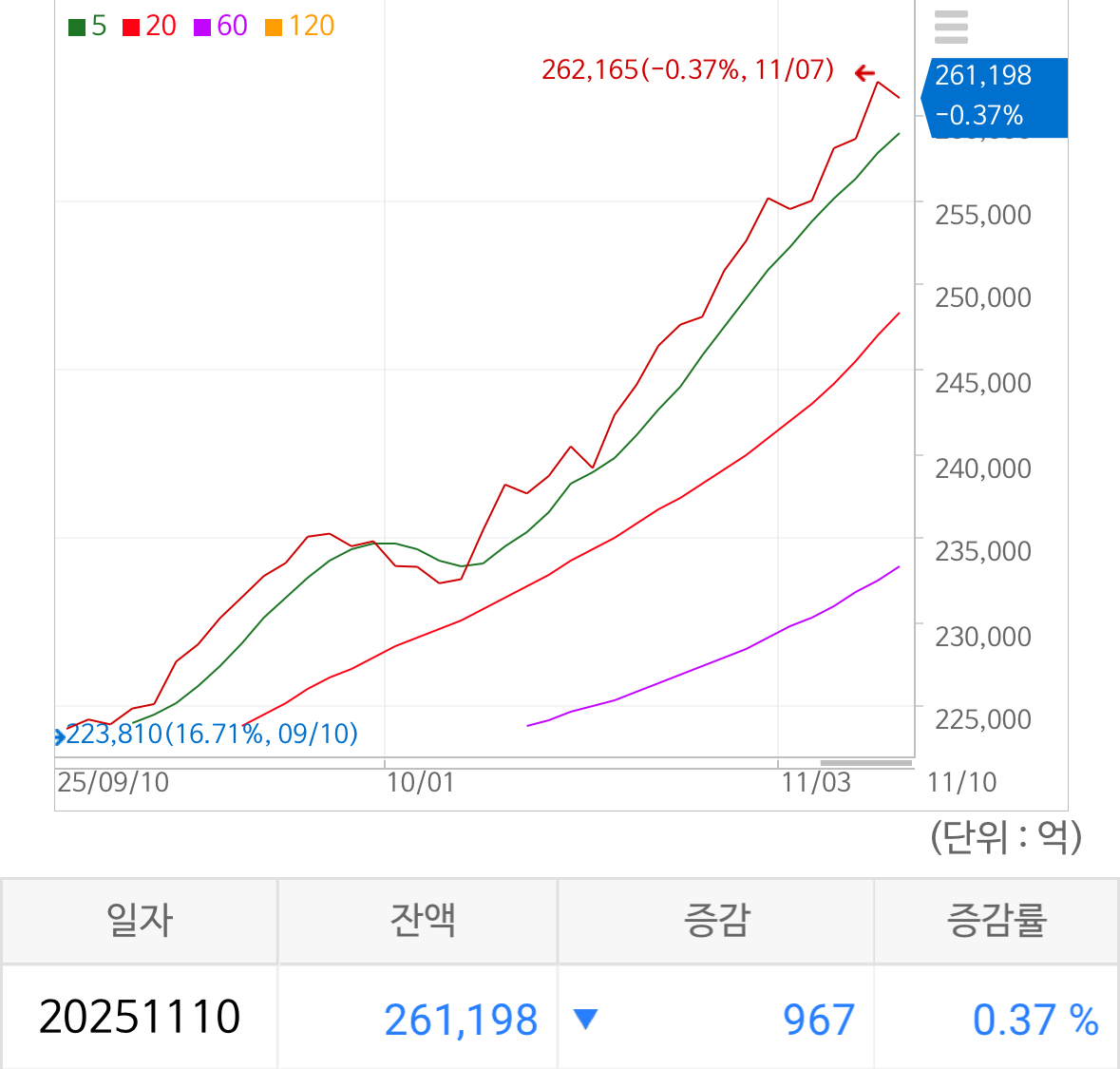 신용 잔고도 오랜만에 꺾였음. 26.1조 가량으로 0.37% 떨어져서 오랜만에 고개를 숙였지만 위치는 5일선 위로 아직은 투심까지는 꺾이지는 않은 모습.