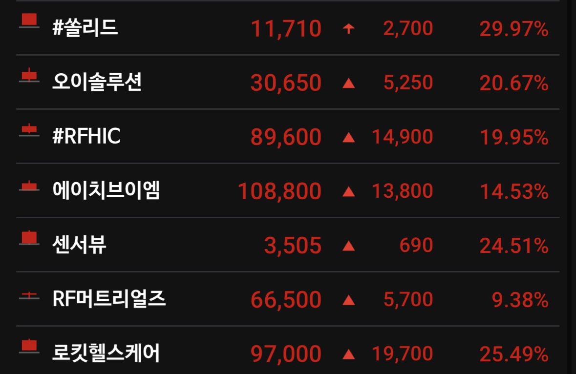 * 상승 종목: 쏠리드(29.97%), 케이엠더블유(29.80%), 대한광통신(29.95%), 오이솔루션(20.67%), RFHIC(19.95%) 등