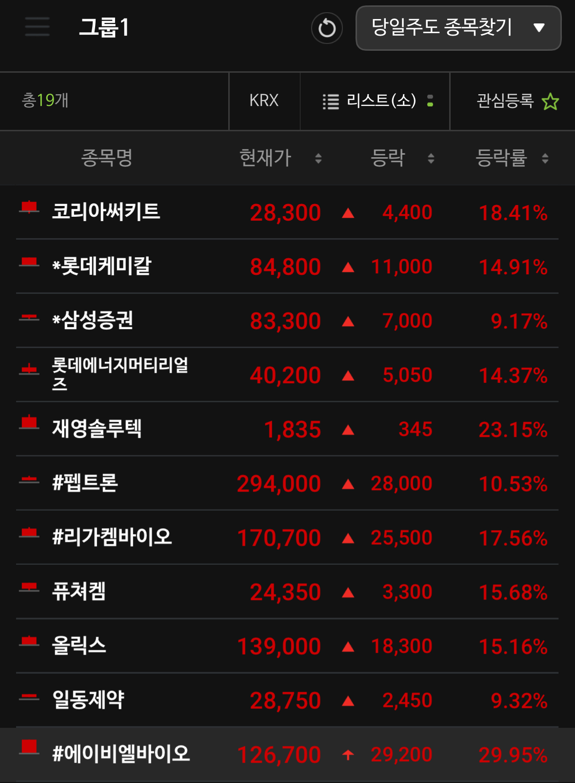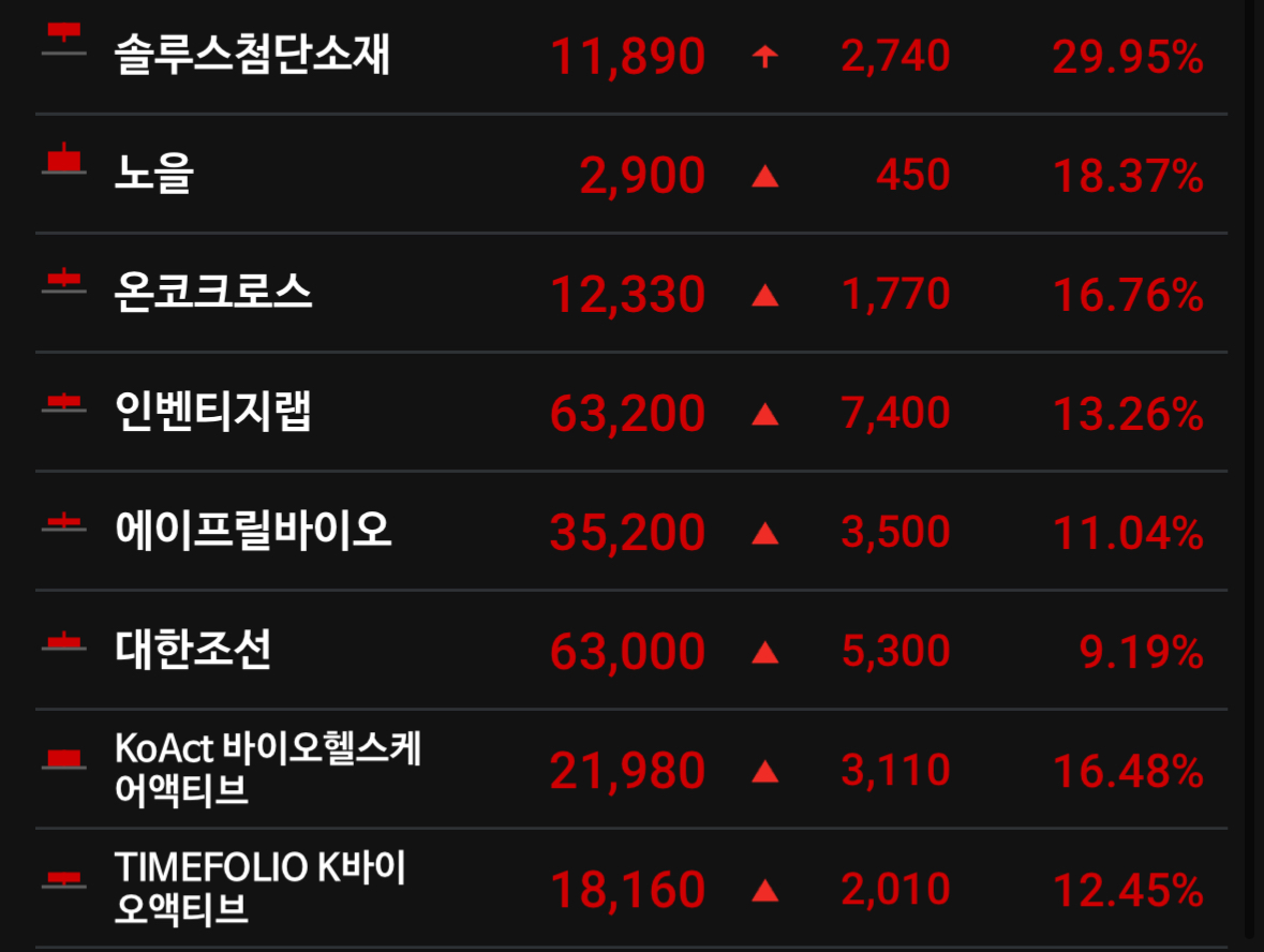 - **기타 고등락 종목(퓨처켐, 올릭스, 노을 등)**: 각 기업별로 바이오파이프라인, 신약 임상결과, 전방산업 호조 등 개별 호재 이슈가 존재합니다.[2]