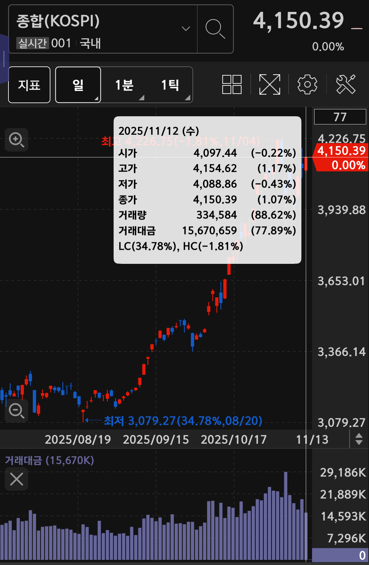 * 코스피의 거래대금은 15.7조 가량으로 22.11% 하락하는 모습. 양봉이 나왔지만 대금이 적어서 의미는 없는 듯.