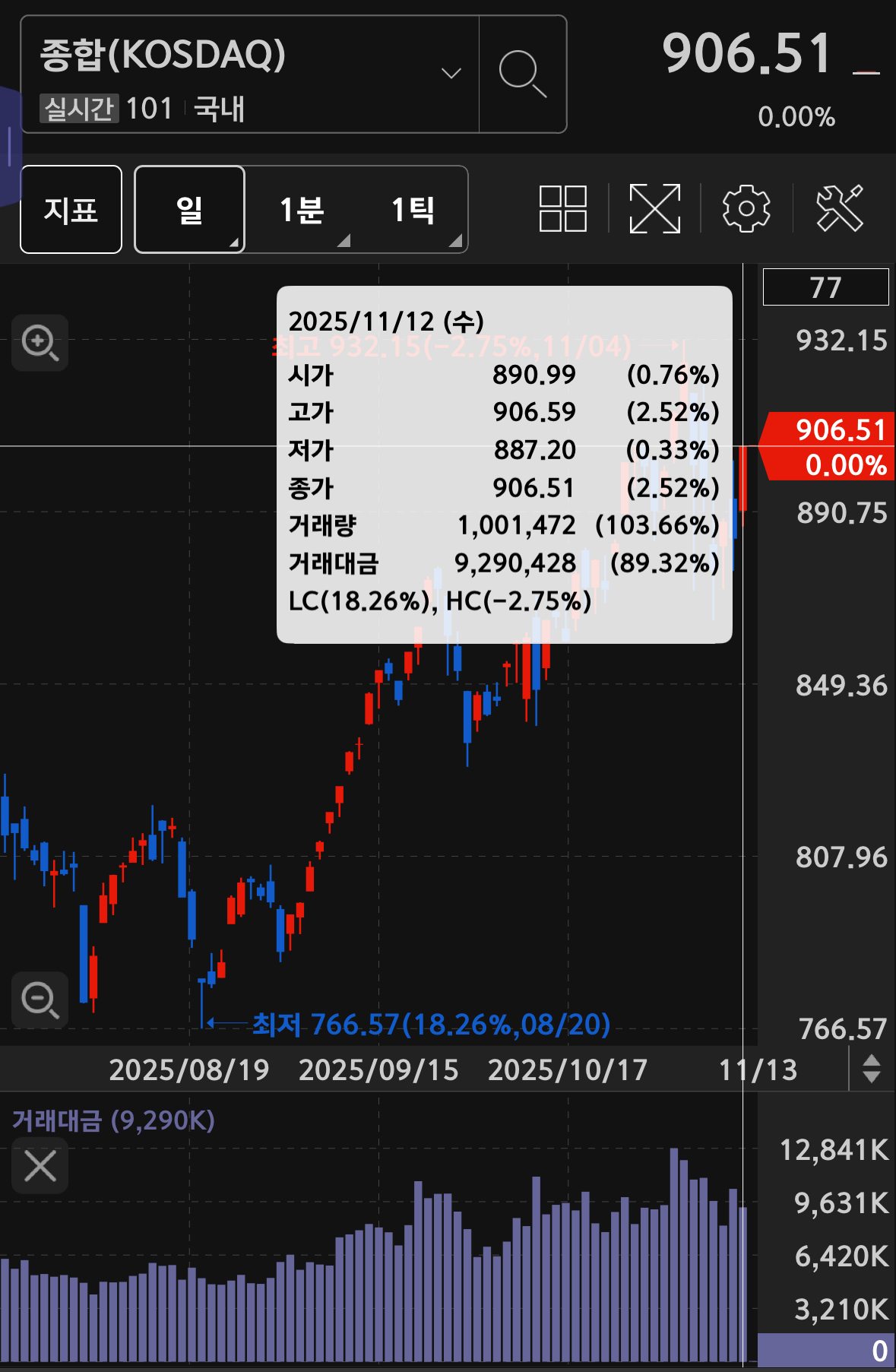 코스닥의 거래대금은 9.3조 가량으로 10.68% 하락하였음. 역시 양봉이지만 대금이 줄어서 큰 의미는 붙이지 말아야 할 듯.