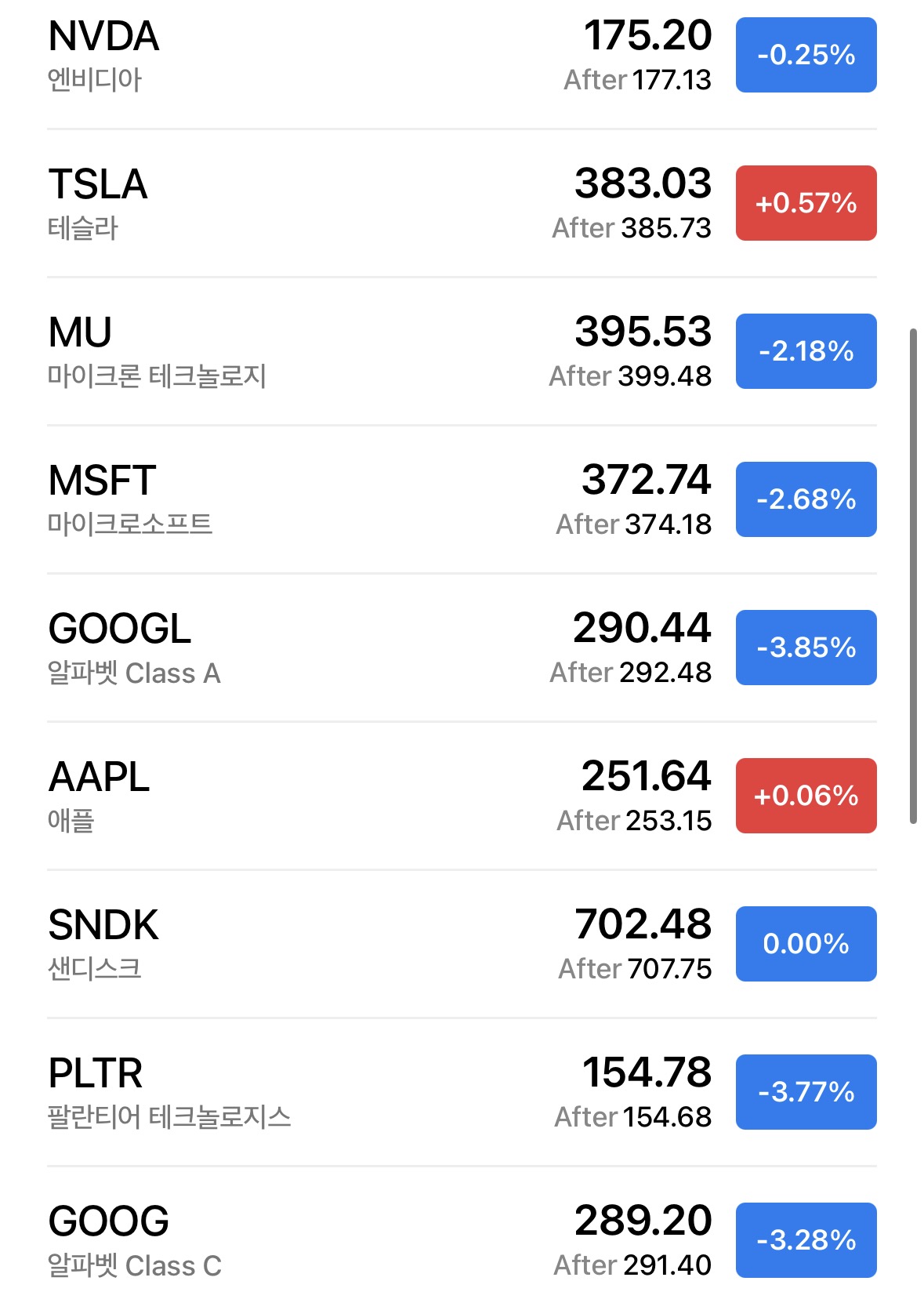 • 마이크론 -2.18%, 마이크로소프트 -2.68%, 알파벳A -3.85%, 팔란티어 -3.77% 등 대부분 기술주 약세.