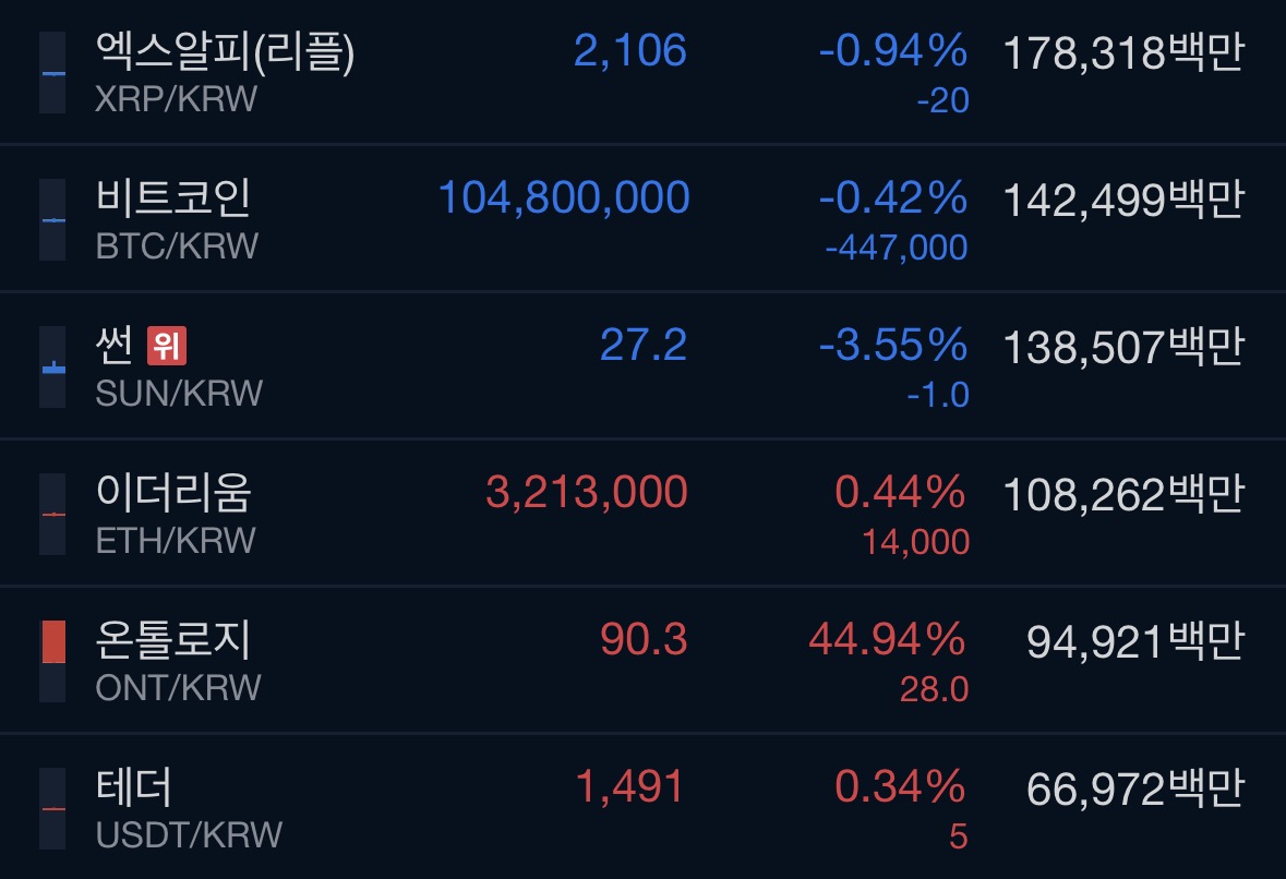• 비트코인: 약 1억 480만 원, -0.42%