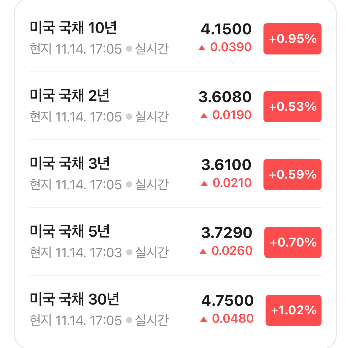 * 미국 국채 금리는 1% 미만의 상승이 기록됨. 장단리차가 0.542 포인트가 되며 약간 더 늘어나는 모습.