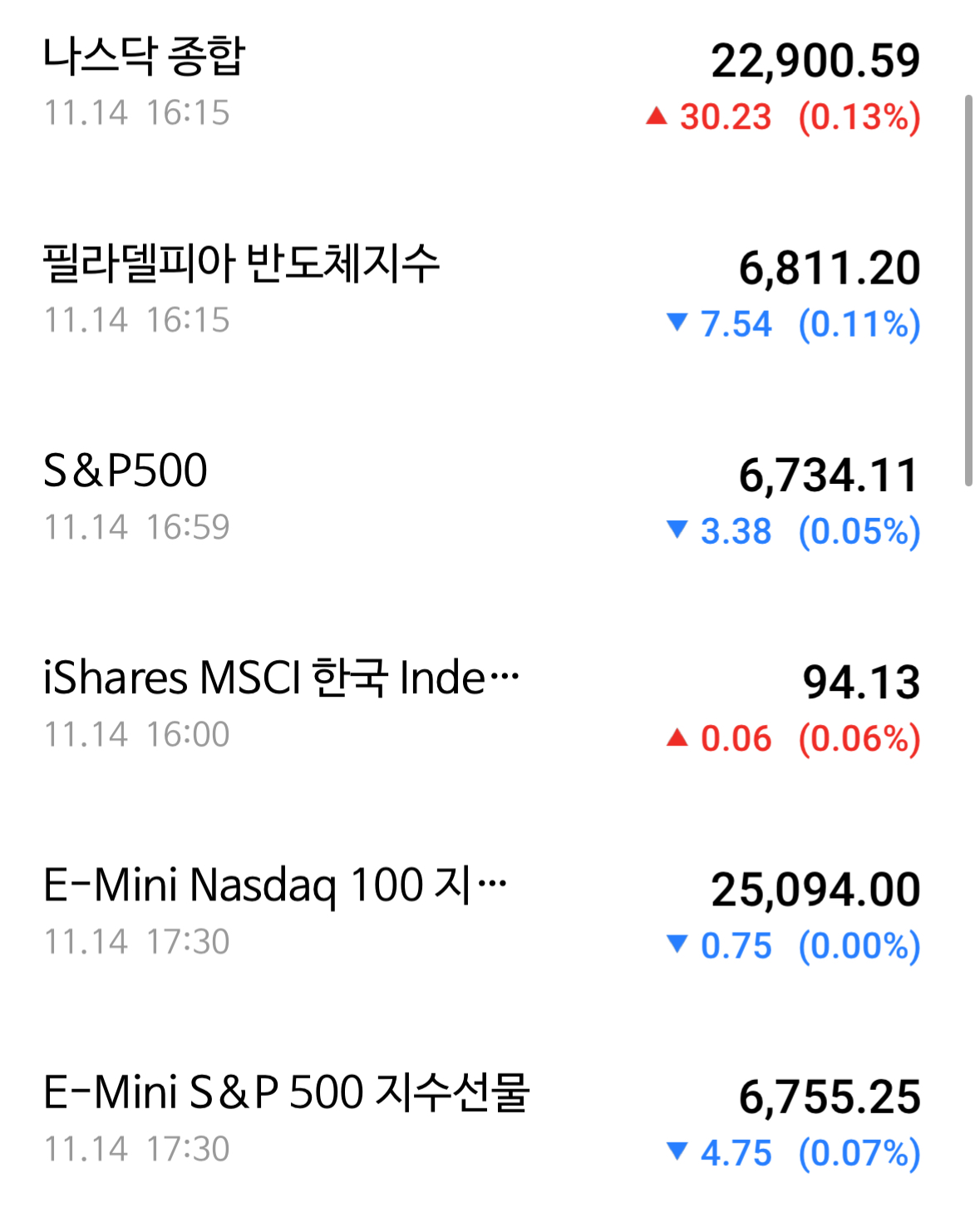 * 나스닥은 0.13% 상승에 그치며 마무리 되었음. 엔비디아 1.77% 상승 등 대부분 소소한 움직임을 보임. 마이크론 테크놀로지정도가 4.17% 상승으로 약간 눈에 보이는 정도. 여전히 고점과 경기 걱정에 정신없는 모습.