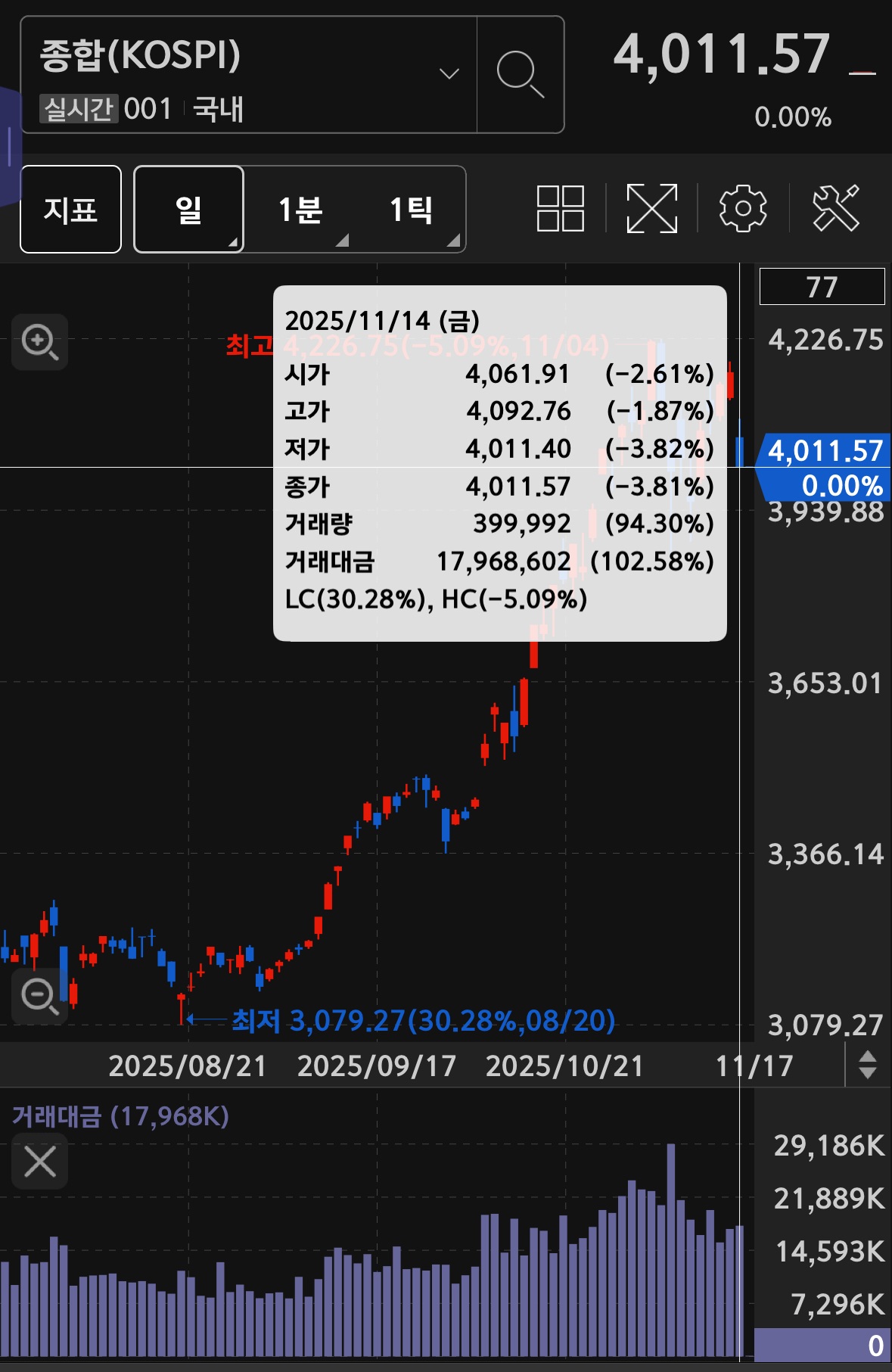 * 코스피의 거래대금은 18조 가량으로 2.58% 증가한 상태에서의 긴 음봉이었음.