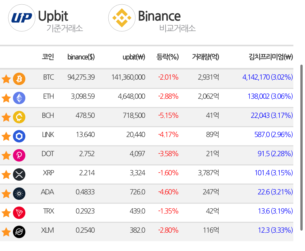 * 비트코인은 1억 4,136만원까지 떨어지고 있음. 전일 대비해도 2%정도나 떨어진 모습. 김프는 3%대로 해외와 국내의 흐름이 비슷하게 돌아가고 있는 듯.