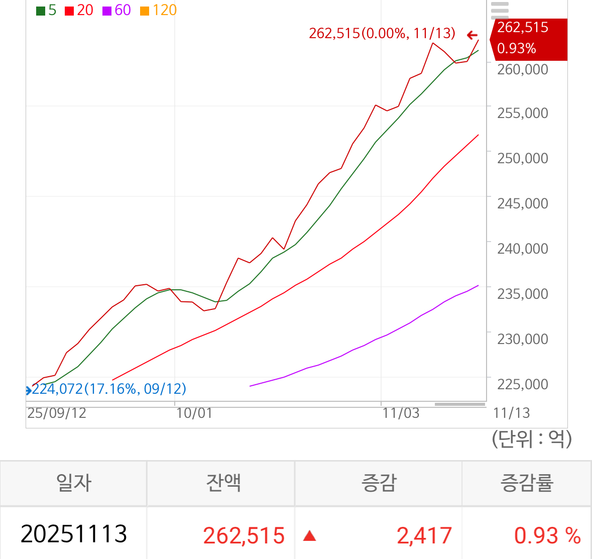 신용 잔고는 26.3조 가량으로 0.93% 상승하며 5일선을 넘기며 강력한 모습을 보이고 있었음.