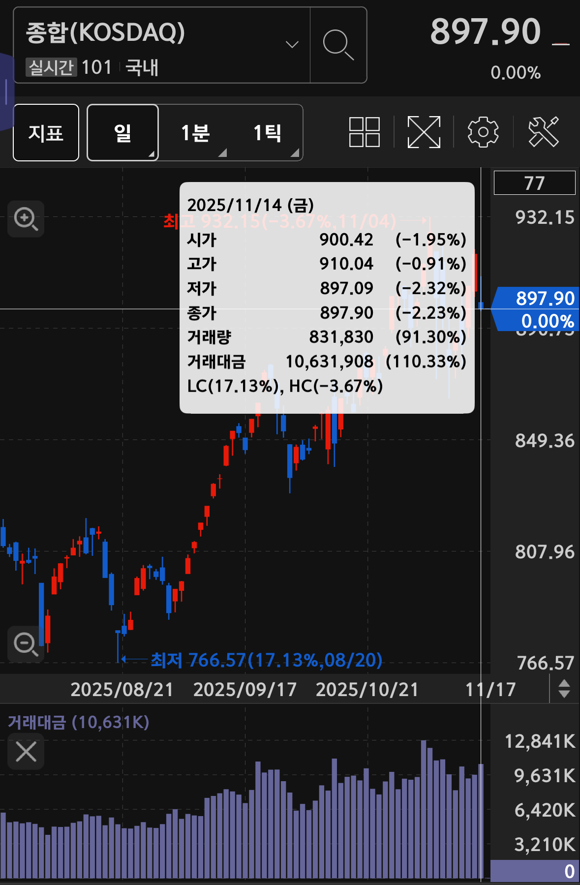 코스닥의 거래대금은 10.6조 가량으로 10.33%나 증가한 짧은 음봉이 기록됨.