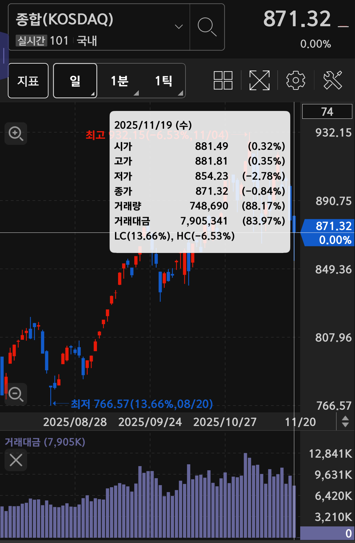 코스닥의 거래대금은 7.9조 가량으로 16% 가량 줄어들었음. 봉의 모습은 코스피와 유사한 긴 음봉 중 아래 꼬리도 길게 나오는 모습임.