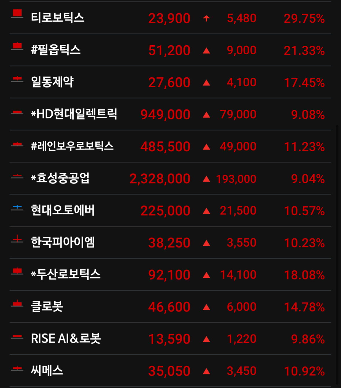 첨부한 이미지에 나온 오늘의 주도주(티로보틱스, 필옵틱스, 일동제약, HD현대일렉트릭, 레인보우로보틱스, 효성중공업, 현대오토에버, 한국피아이엠, 두산로보틱스 등) 분석을 뉴스 기반으로 정리하면 아래와 같습니다.[1][2][3][4][5]