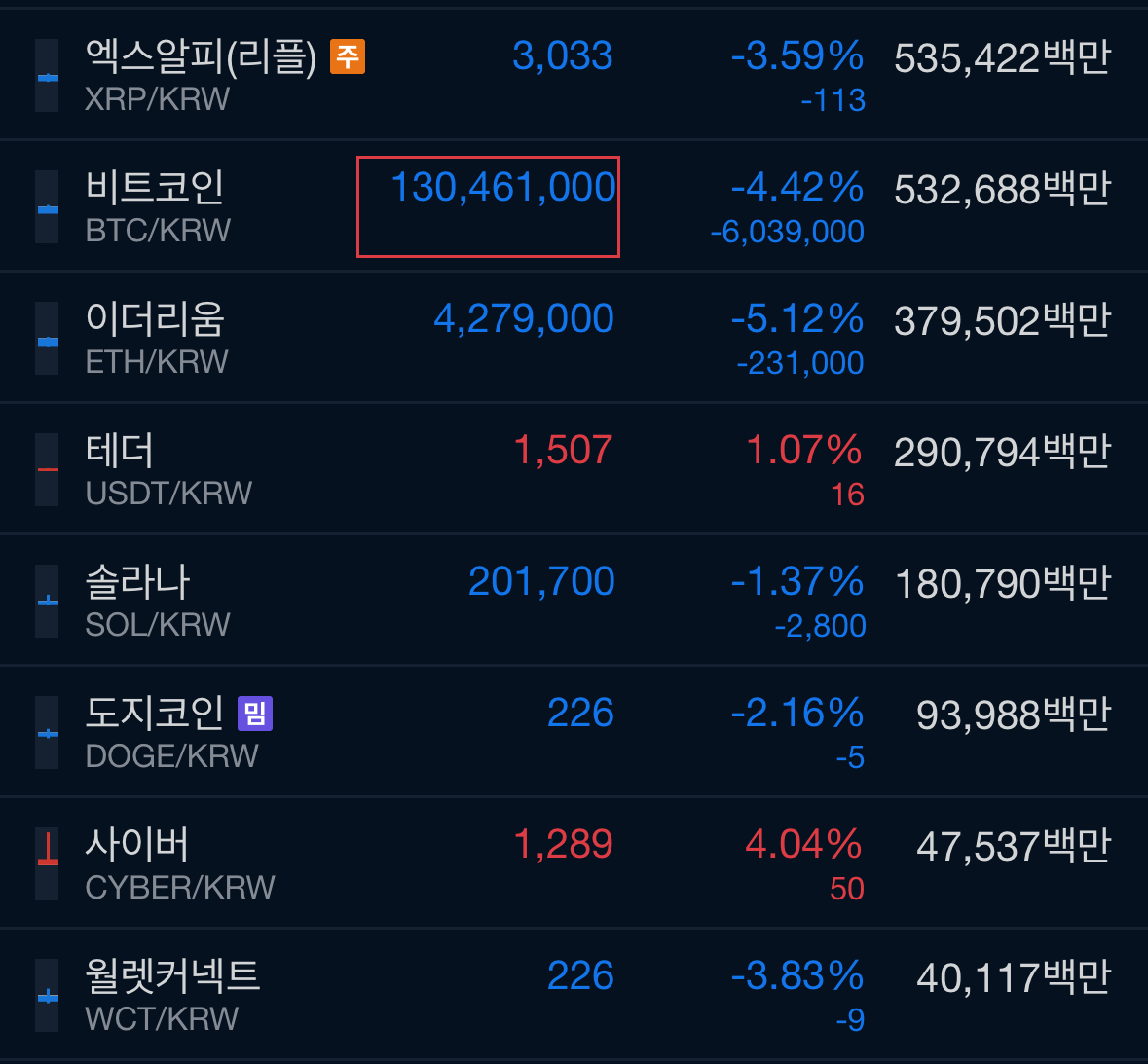 * 비트코인은 1억 3,046만원까지 내려오며 전일 대비 4.42% 더 하락하고 있음. 시장에 안 좋은 소문이 퍼지며 비트코인에 대한 신뢰가 흔들리고 있다고 함.