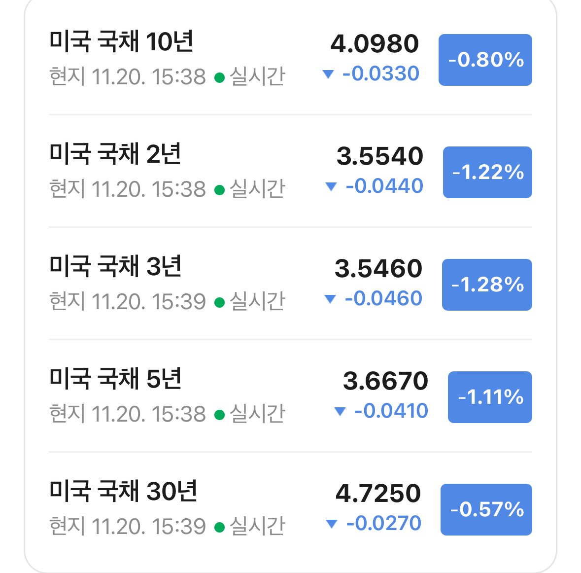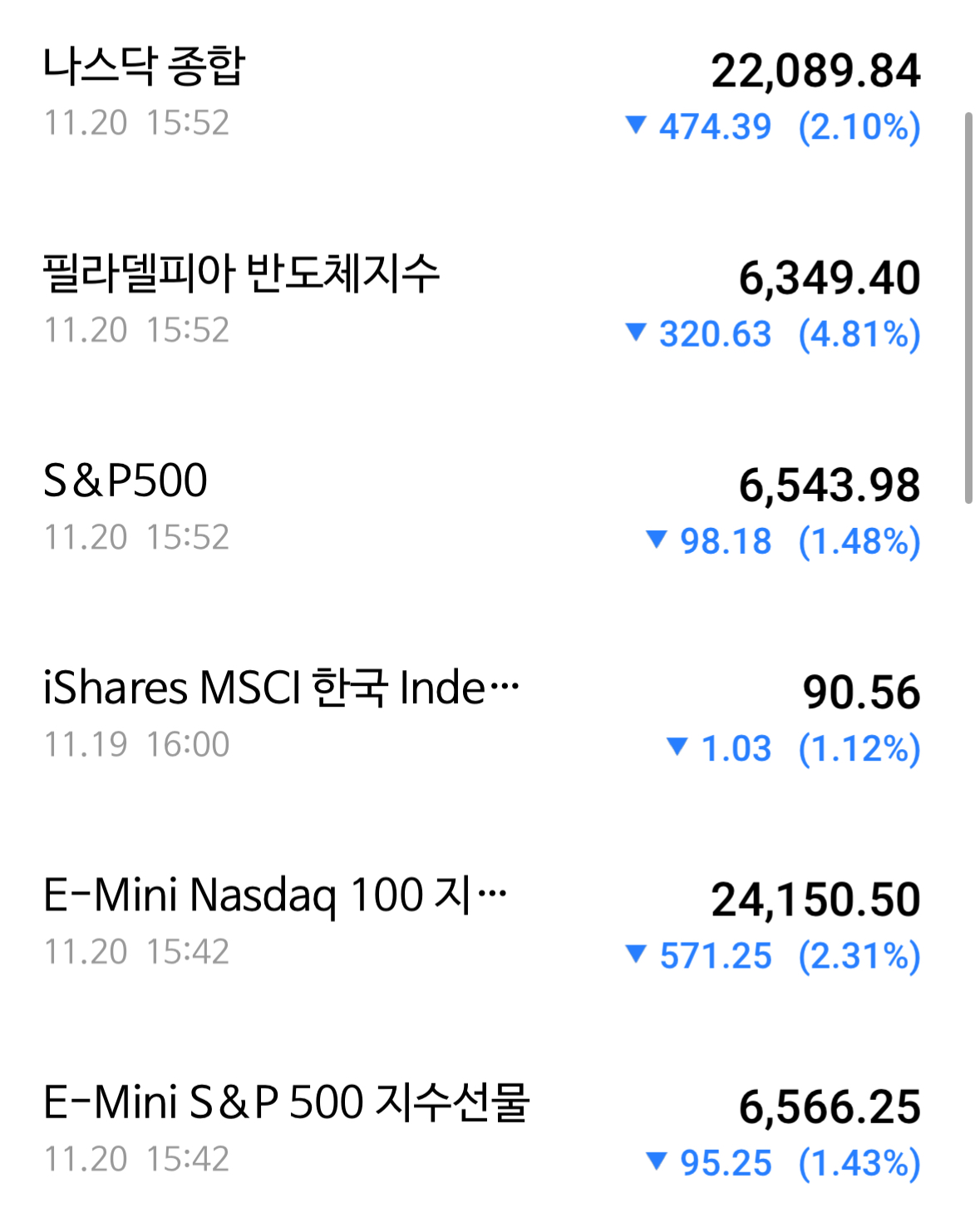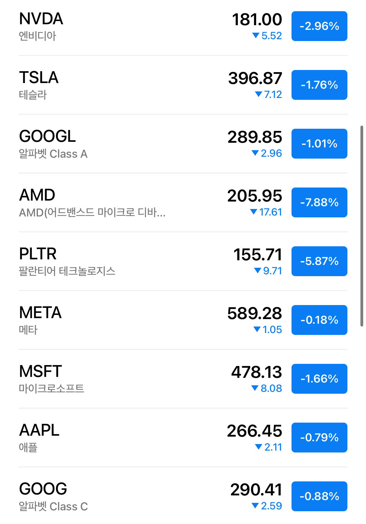 * 나스닥은 2.1% 하락으로 마무리 되고 있음. 고용지수가 좋게 나오면서 금리 인하는 높은 확률로 없을 것이라는 이야기가 나옴. 또한 AI관련주 고점 이야기가 나오면서 하락으로 방향으로 잡고 있음. 엔비디아가 2.96% 떨어지고 AMD 7.88%, 팔란티어가 5.87% 같이 떨어지며 하락을 이끌고 있음.