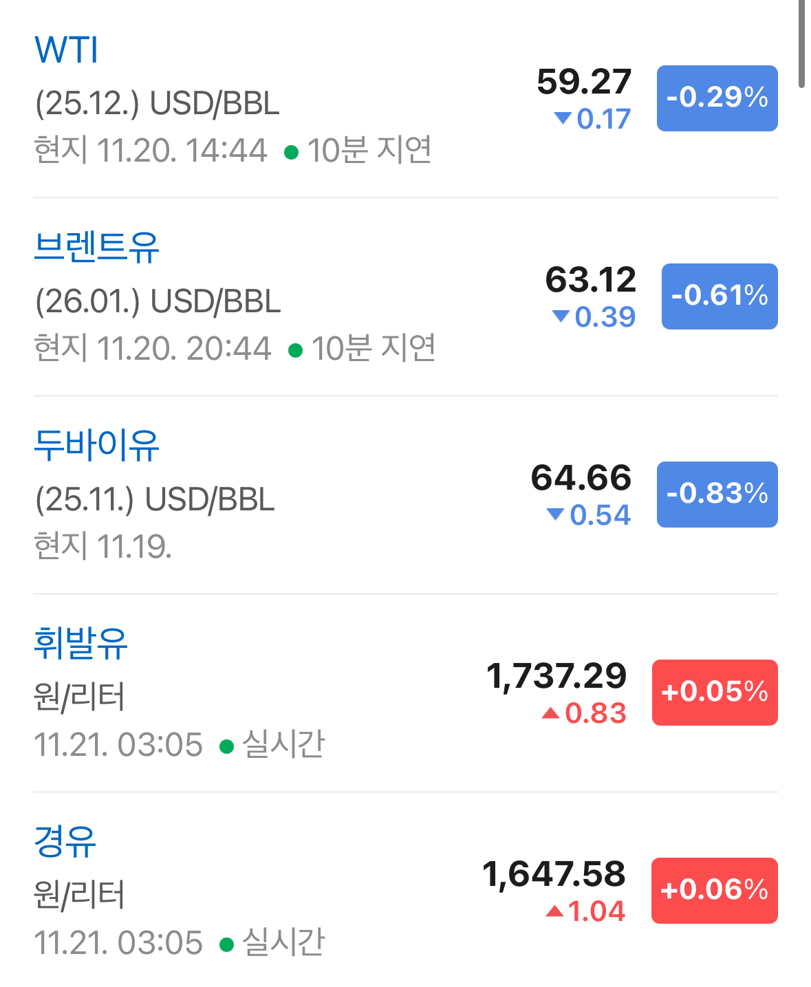 * 국제 유가는 보합권의 하락이 나오고 있음. 특별한 뉴스는 찾지 못 함. WTI기준으로 59.27달러가 되며 0.29% 하락 중.