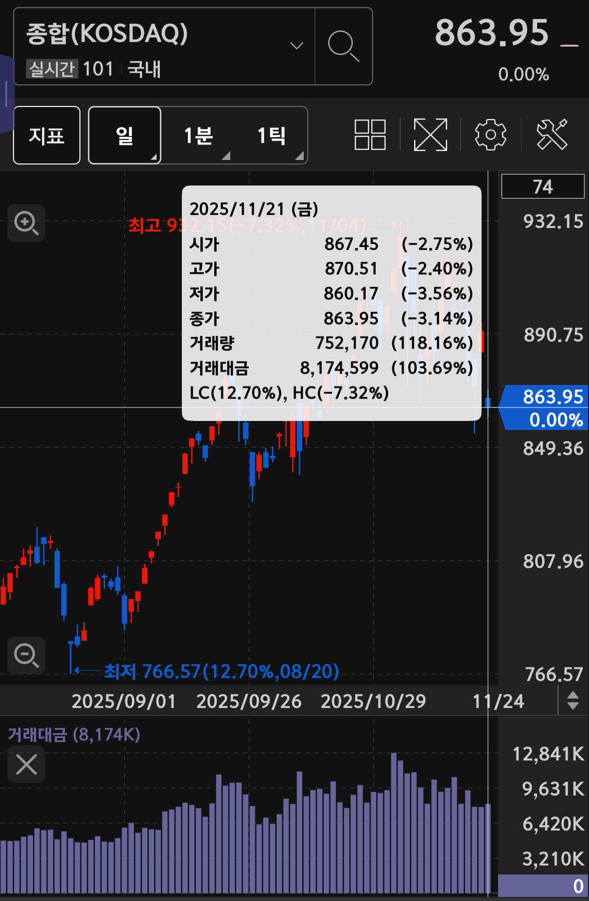 * 코스피의 거래대금은 14.2조가 되며 6.45% 하락이 나오면서 작은 거래대금에 길쭉한 음봉이 기록됨.