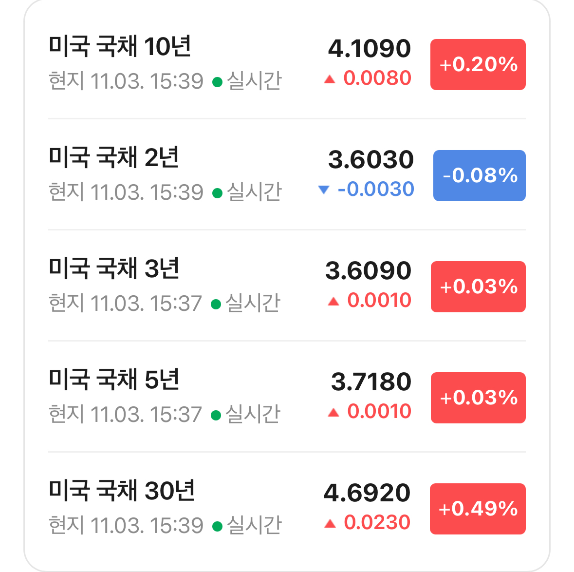 * 미국 국채 금리는 보합권에서 움직이며 거의 움직이지 않음. 장단리차는 0.506 포인트로 거의 변동 없음.
