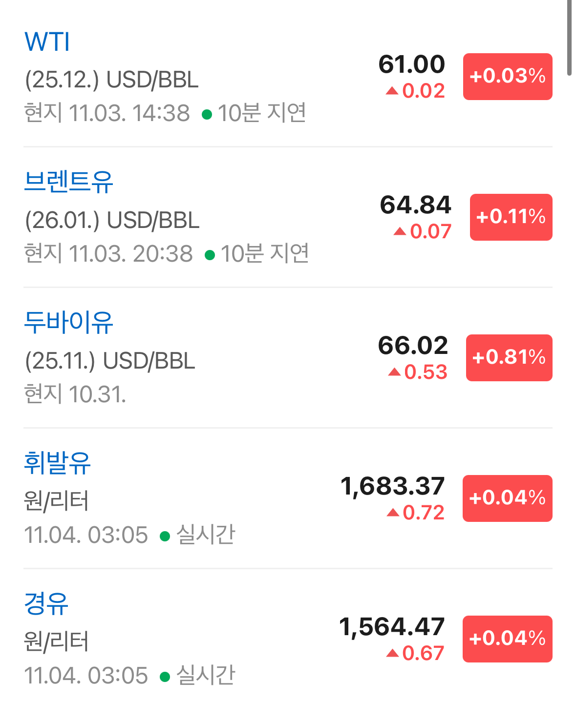 * 국제 유가도 신기하게 거의 변동이 없음. WTI 기준으로 61달러가 되며 0.03% 상승에서 움직이는 중. OPEC+가 증산을 멈추고 오를일만 남았다더니 아직 적용이 안 된 것인지 효과가 없는 듯.