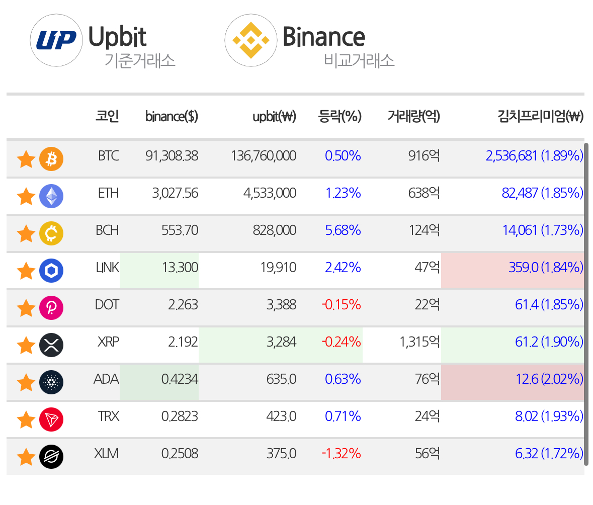 * 비트코인은 1억 3,676만원에 도착하며 0.51% 상승하였음. 김프가 1.89%로 안정적인 모습.