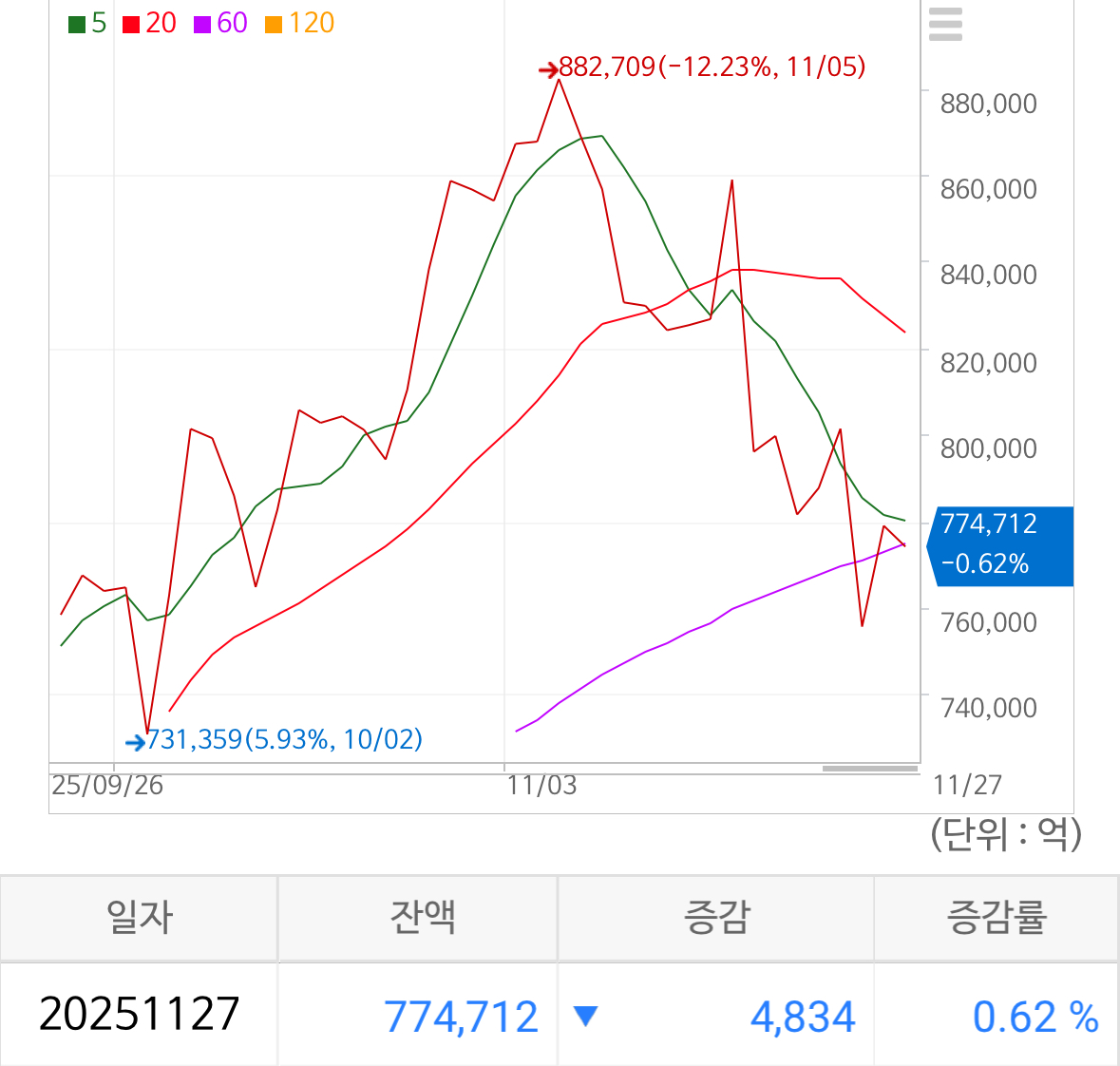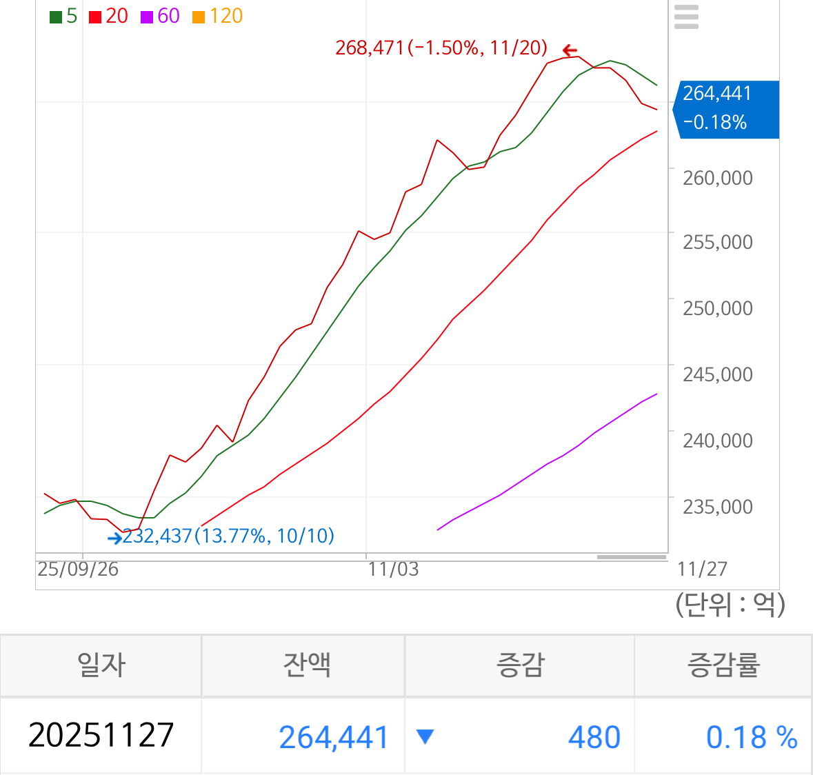 신용 잔고도 26.4조 가량으로 0.18% 떨어지며 서서히 가라앉고 있음. 아직은 20일선 위에서 버티는 중.