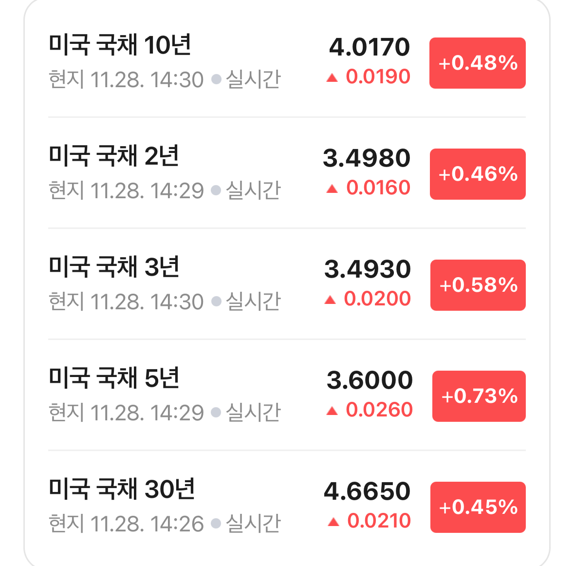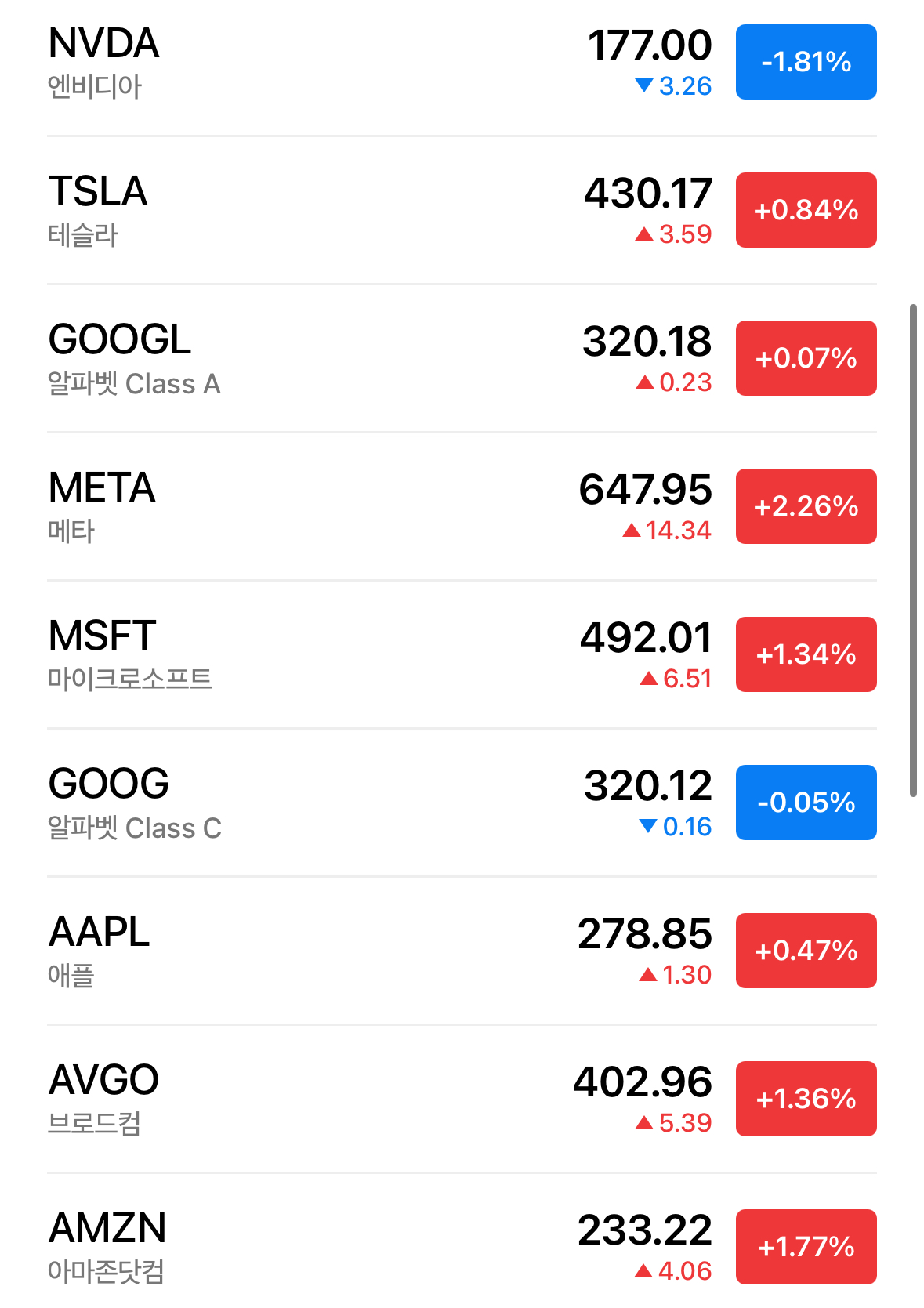 * 나스닥은 0.65% 상승으로 마무리. 추수감사절 다음날 단축된 시간만 개장된 것이라서 큰 움직임은 없었음. 메타가 2.26% 오른 것이 가장 큰 상승으로 보임. 대부분의 종목이 2% 안쪽에서 등락이 있었음. 구글은 보합세, 엔비디아는 1.81%로 조금 더 떨어지고 있었음.
