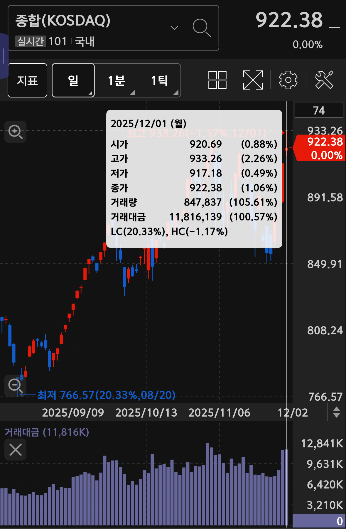 코스닥의 거래대금은 11.8조 가량으로 0.57% 상승한 수치로 어느새 코스피와 어깨를 나란히 하며 기세가 등등한 모습.