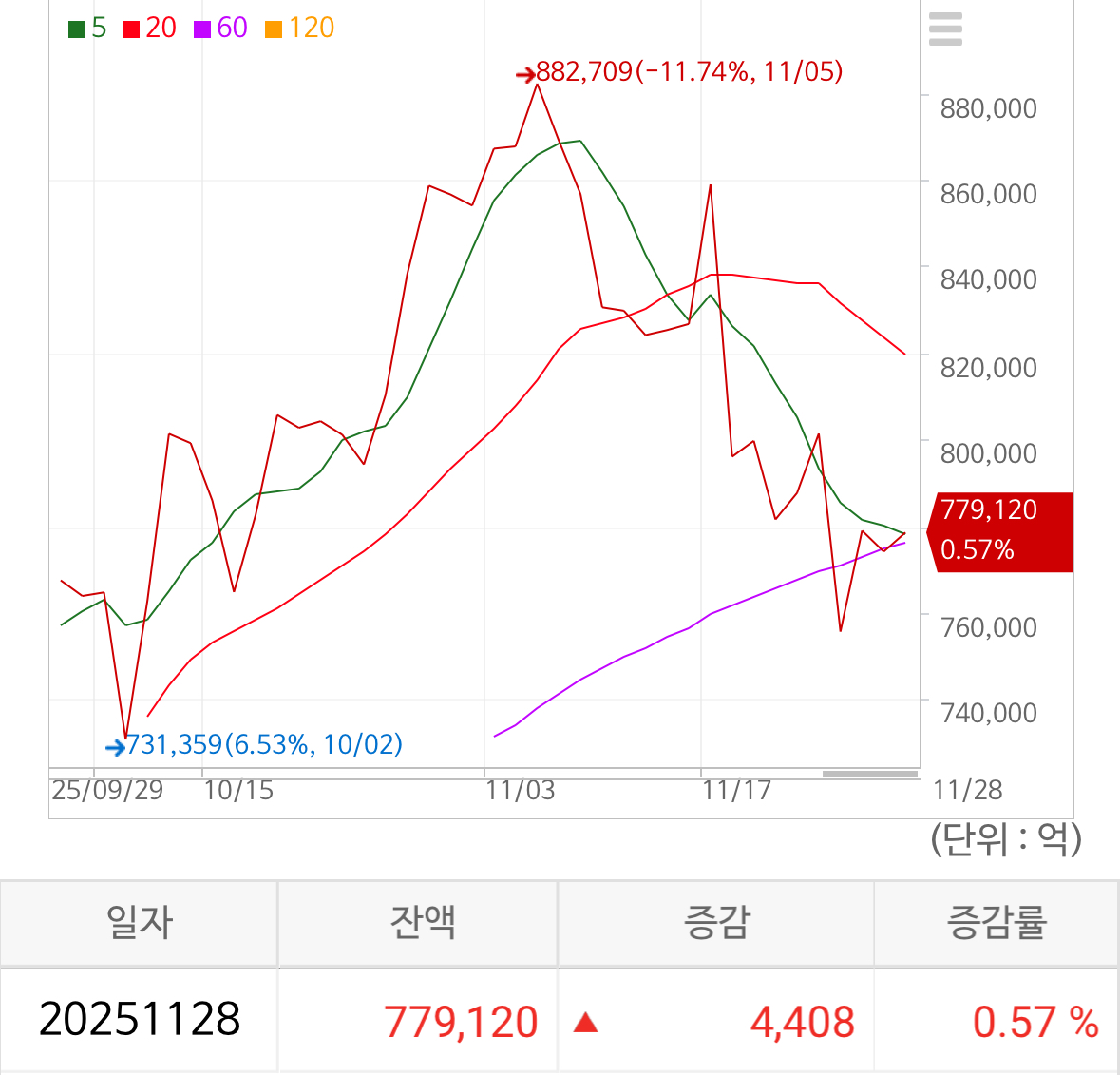 * 지난 금요일 고객예탁금은 77.9조가 되며 0.57% 상승하며 60일선과 5일선이 함께 노닐며 어울리는 중.