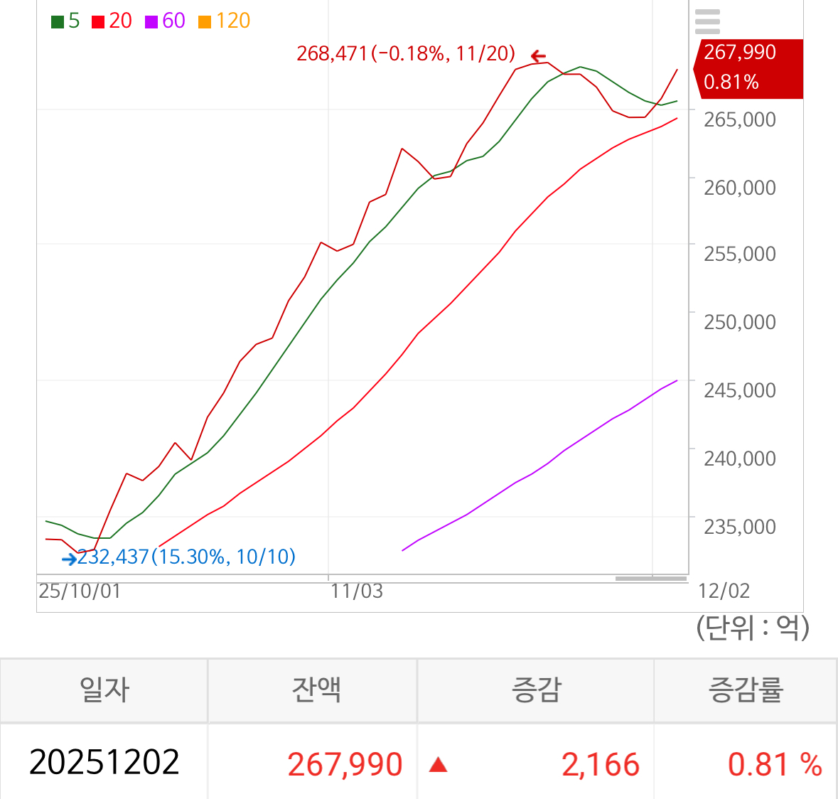 신용 잔고는 26.8조 가량으로 0.81% 상승하는 청개구리의 모습.