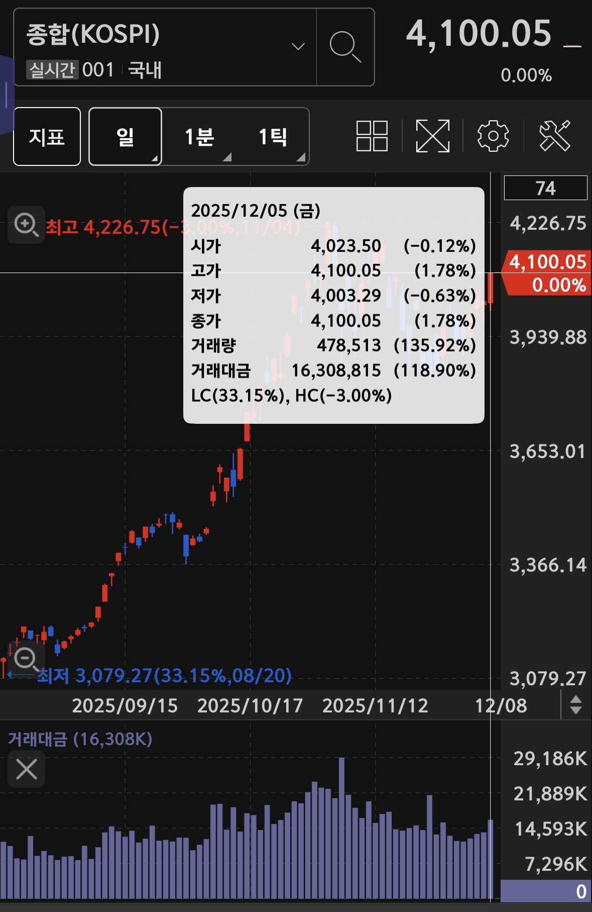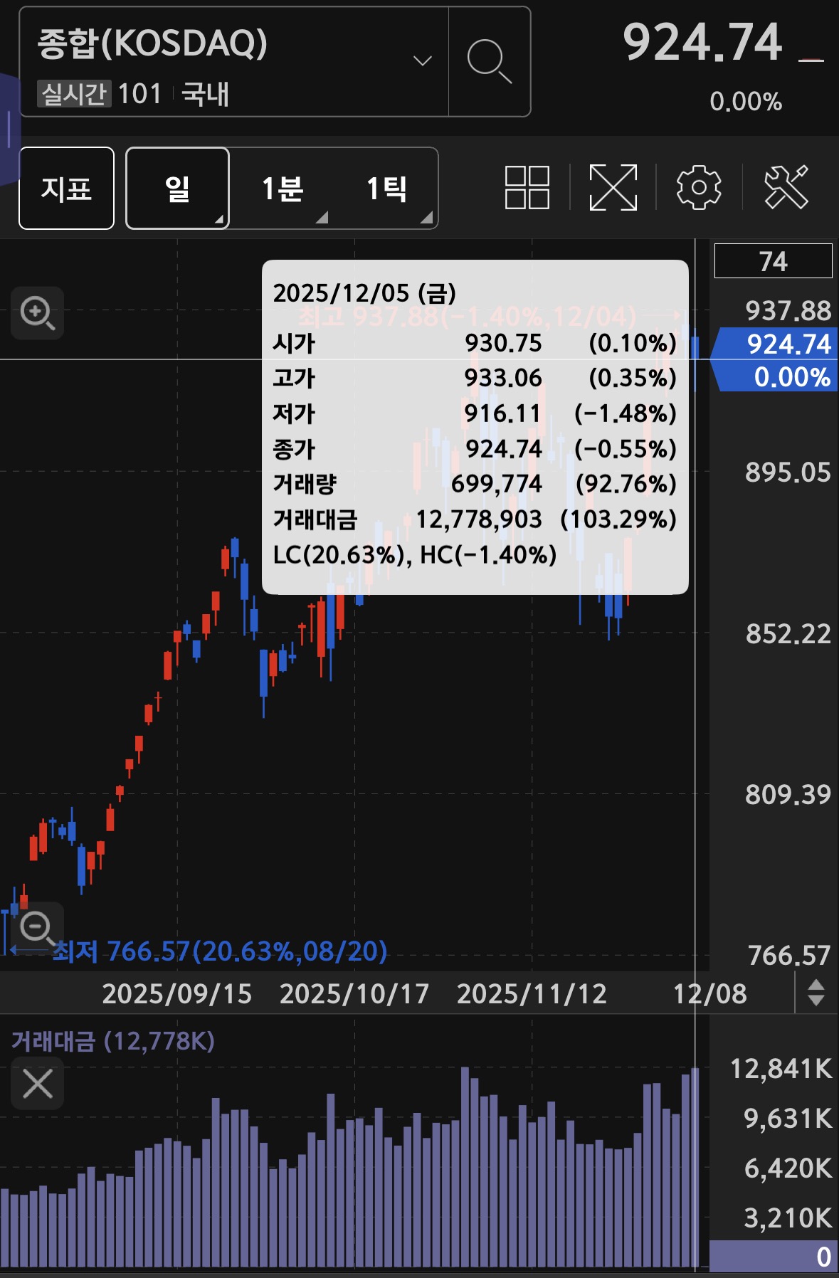 코스닥의 거래대금은 12.8조 가량으로 3.29% 상승하며 음봉이 나오는 좋지 않은 모습.