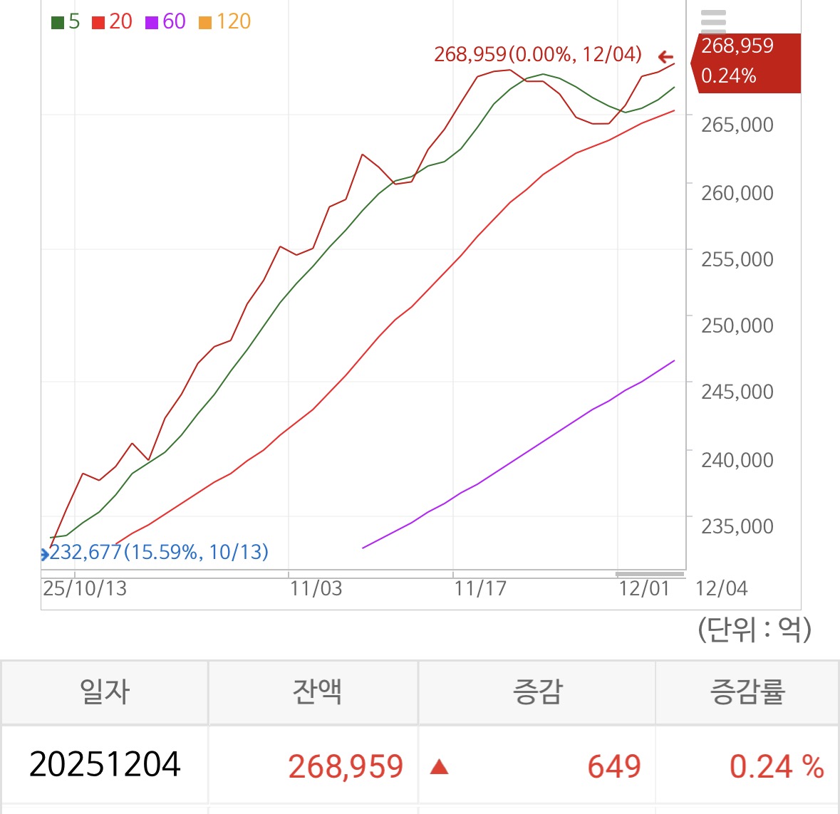 신용 잔고는 26.9조 가량으로 0.24% 상승하며 고점에서 걷고 있음. 힘이 좀 빠졌어도 여전히 강한 모습.