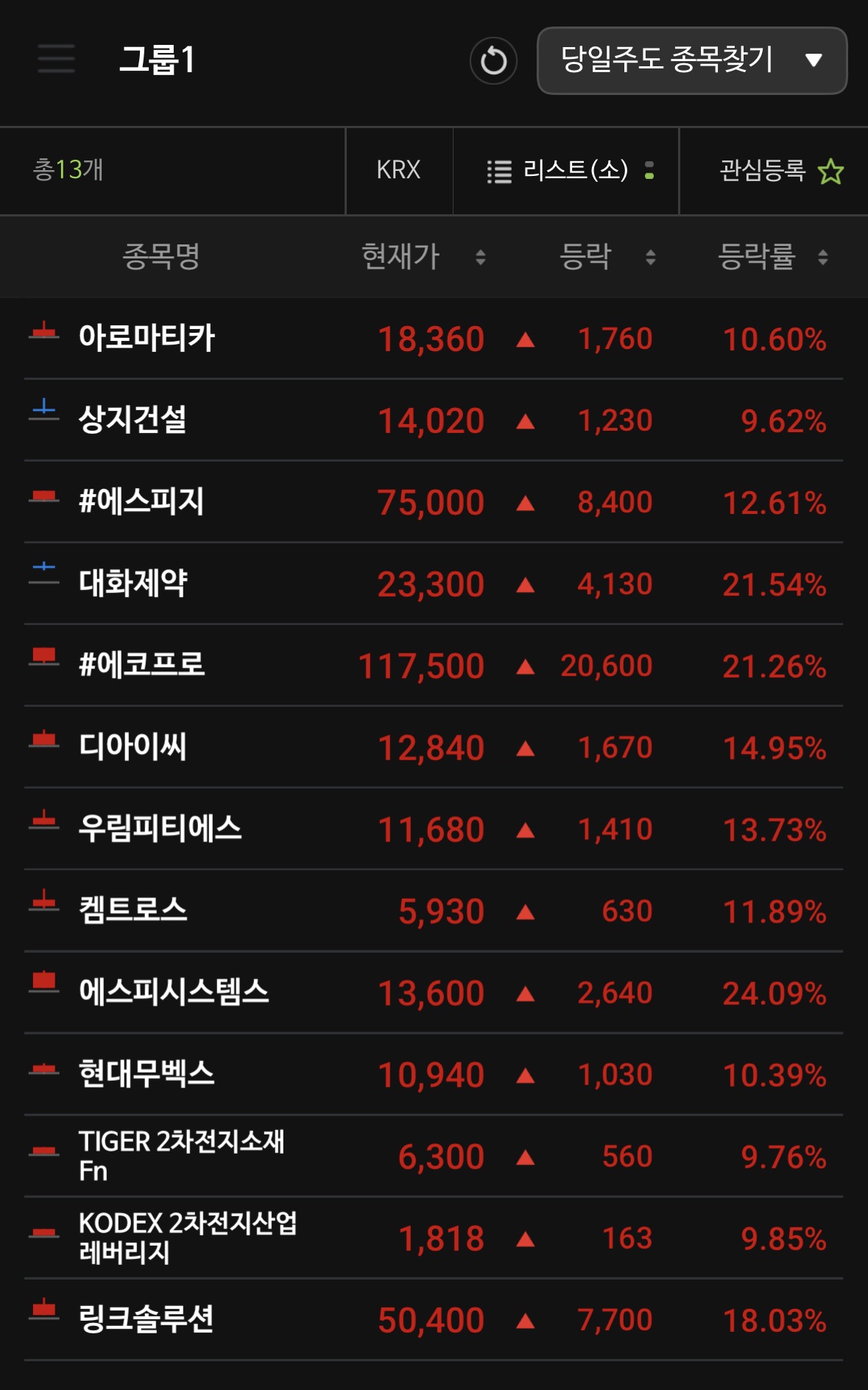 이미지 속 13개 종목은 신규 상장·글로벌 수출·정책·테마 모멘텀 등이 겹친 단기 주도주 군으로, 특히 2차전지(에코프로·관련 ETF), 로봇·자동화(에스피지·링크솔루션·우림피티에스·켐트로스 등), 중국 의약품 허가(대화제약) 이슈가 핵심 축입니다. 대부분 단기 급등 구간이라 뉴스 지속성과 수급 변화에 따른 변동성 관리가 중요합니다.[1][2][3][4][5]