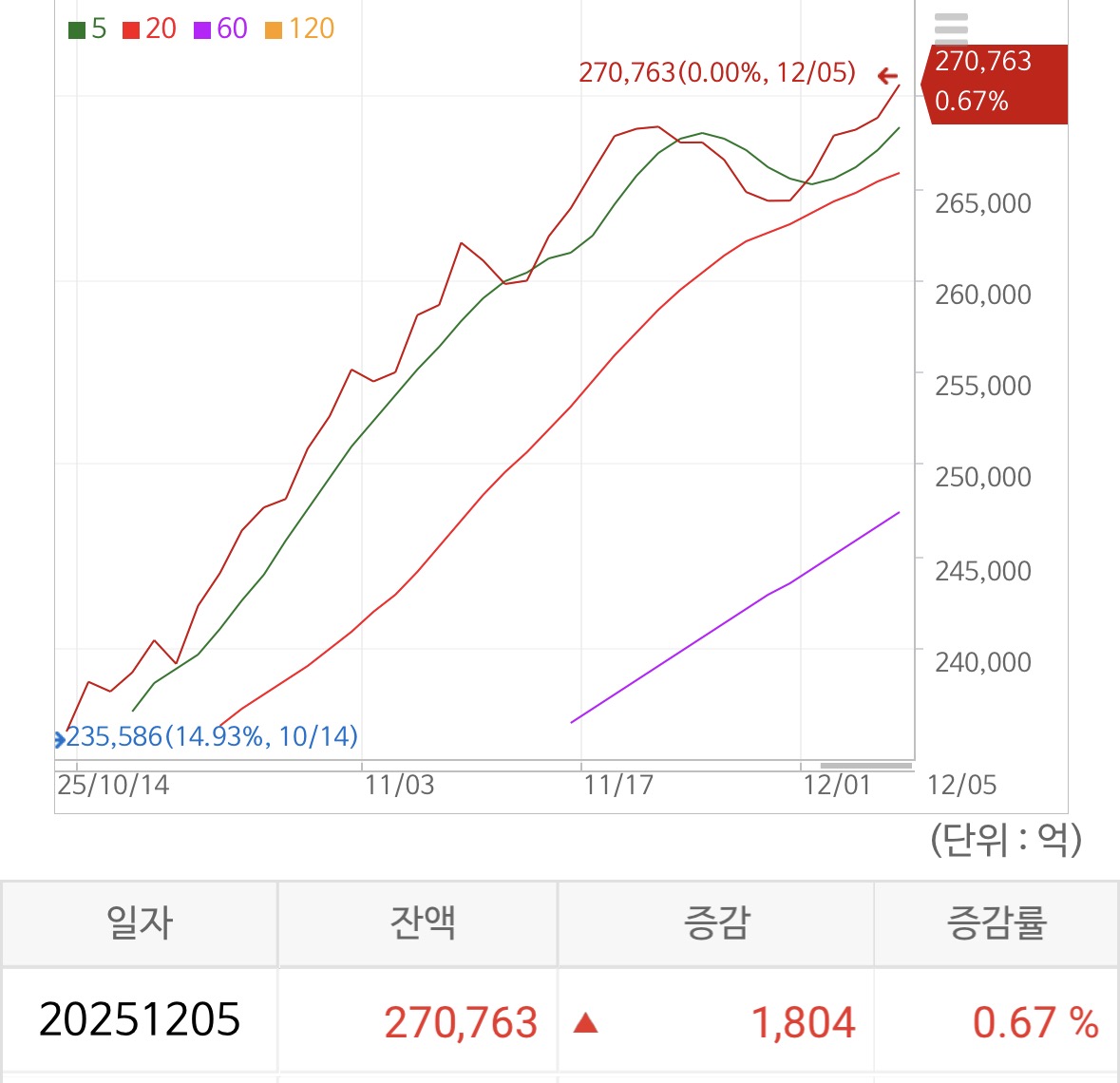 신용 잔고는 반대로 고점을 갱신하며 0.67% 오르고 있었음. 27.1조 가량이 되는 모습.