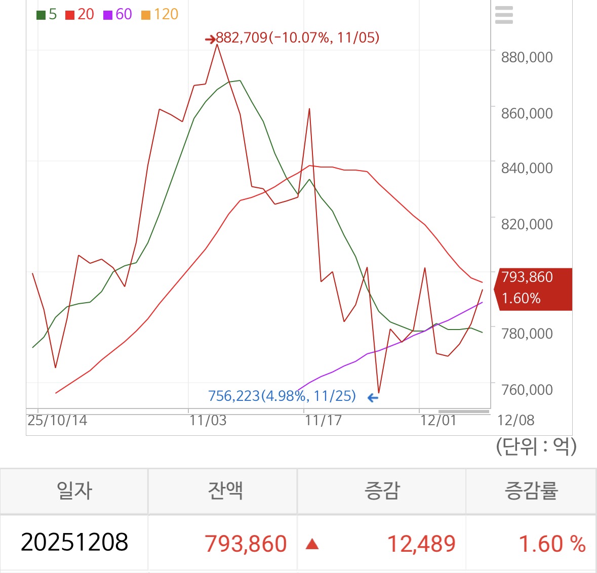 신용 잔고는 여전히 강력함. 5일선 위에서도 가파르게 더 상승하고 있음. 27.4조 가량이 나오며 1.03% 상승함.