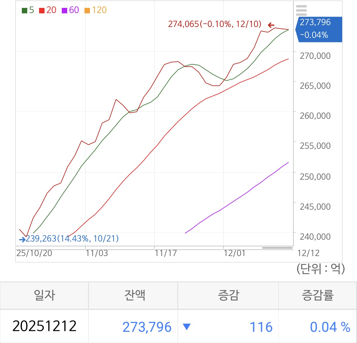 신용 잔고는 27.4조 가량으로 0.04% 하락하였음. 딱 5일선에 붙어 있는데 신용인들의 마음은 연말을 맞이하여 어디로 향할지 지켜봐야겠음.