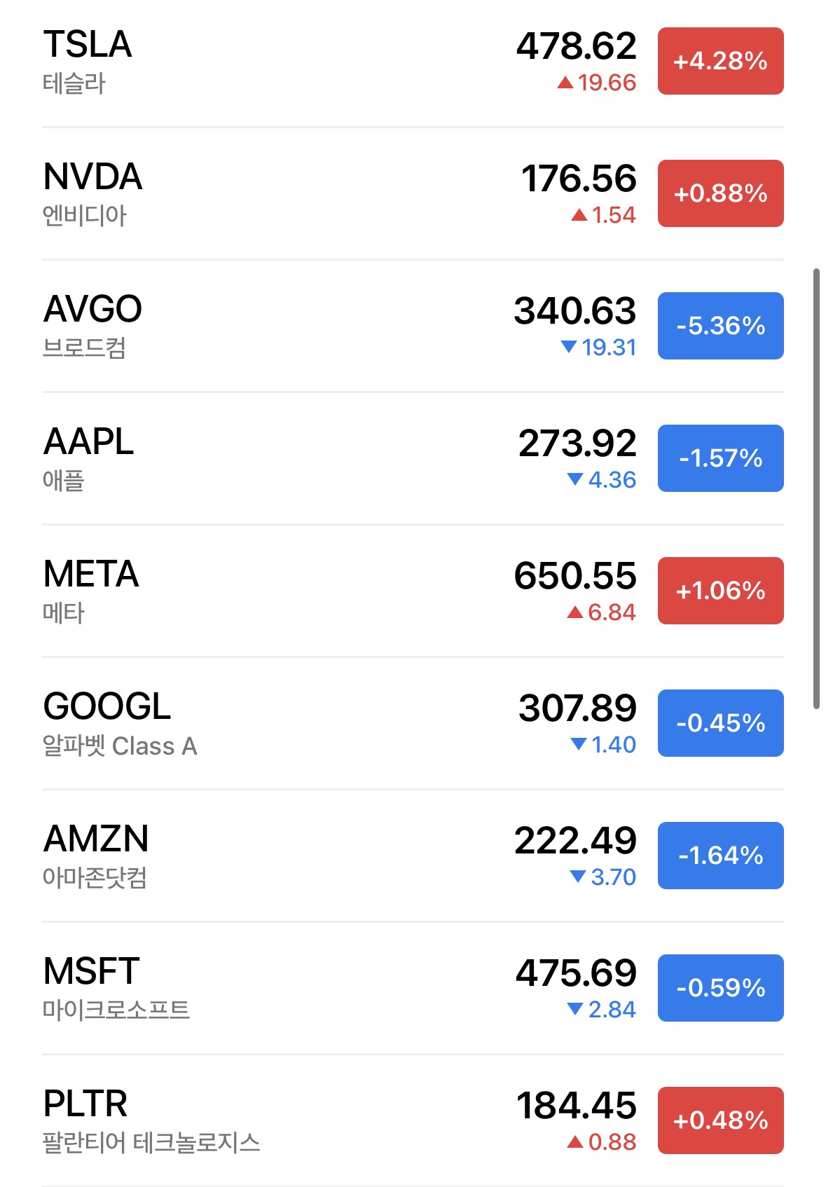 * 나스닥은 0.58% 하락하며 마무리 되고 있음. 로봇 택시 테스트에 한창인 테슬라가 4.28% 상승하였으나 브로드컴이 5.36% 하락하였고 아직은 내려가는 종목이 올라가는 종목보다 많아서 그렇게 나오나봄.