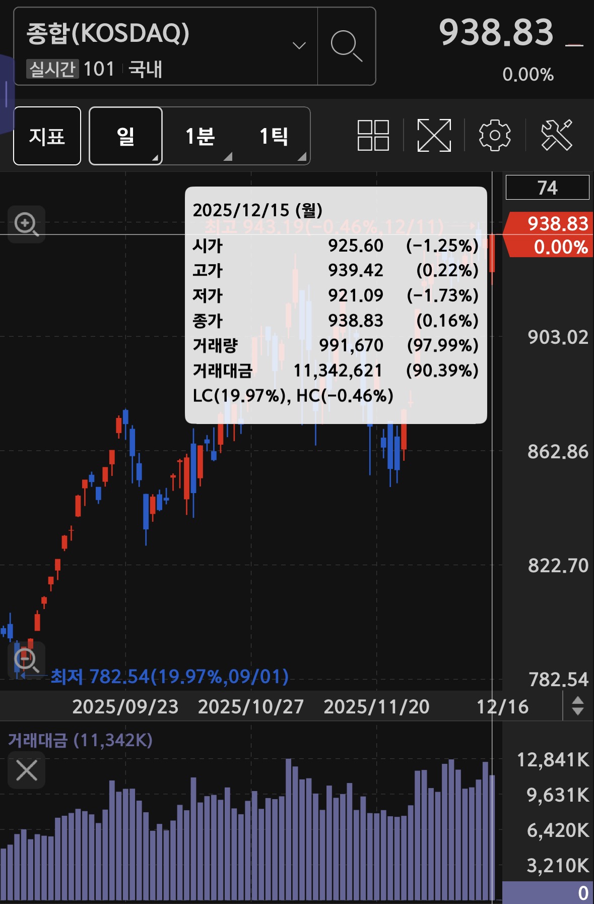 코스닥의 거래대금은 11.3조 가량으로 9.61% 하락한 수치가 나왔으나 길쭉한 양봉에 예전 거래대금에 밀리지 않는 것을 보면 기대하게 만드는 듯.