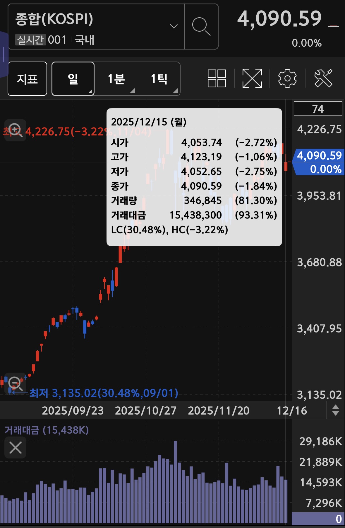 * 코스피의 거래대금은 15.4조 가량으로 6.69% 하락한 수치였음.