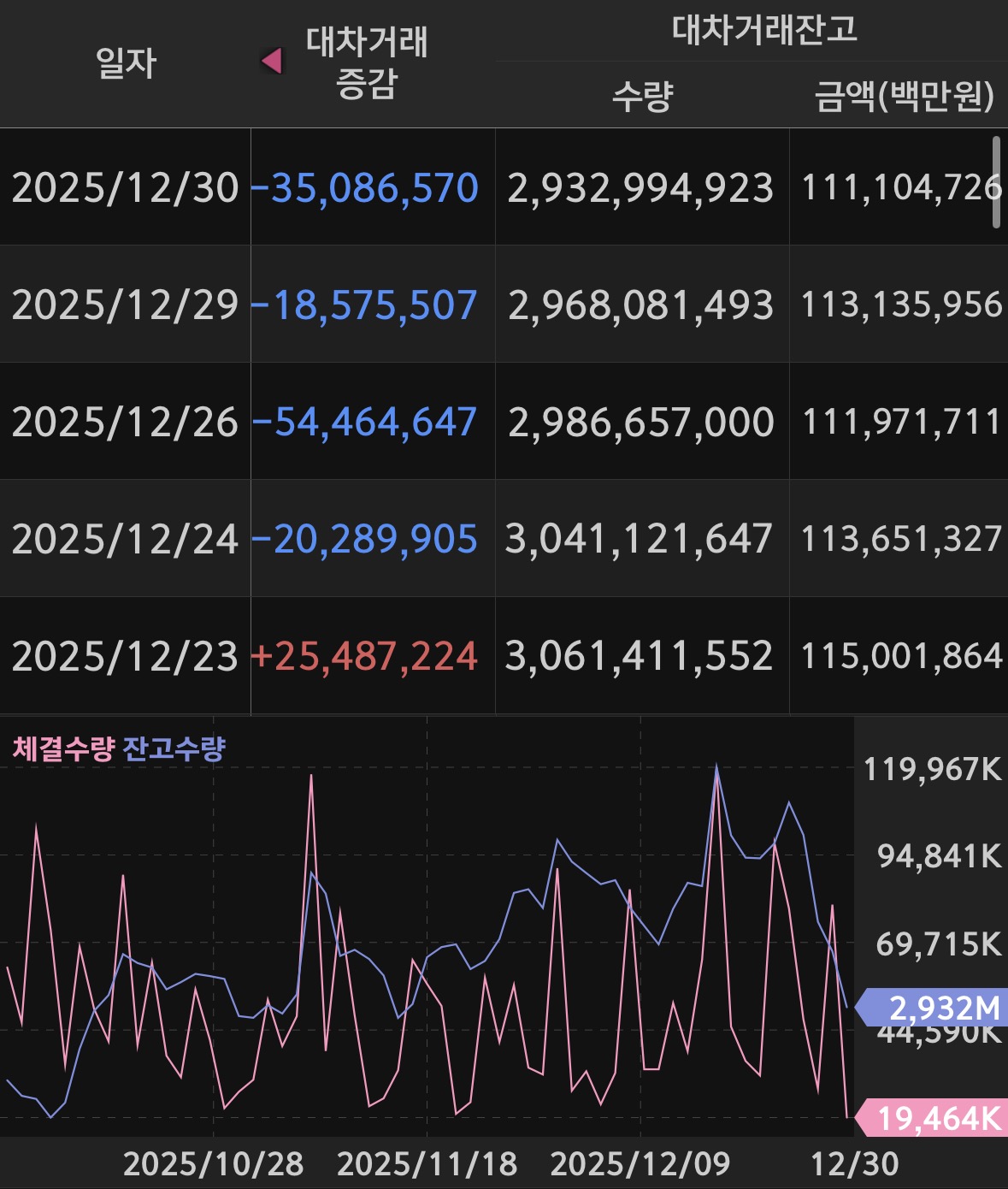 * 대차 잔고는 지난 화요일에 2조 가량을 털어내며 최근 하단인 111조를 지키는 모습. 거래대금과의 비교는 4.67배로 한국장의 거래대금이 연말을 맞이하여 많이 줄어든 것이 이유인듯.
