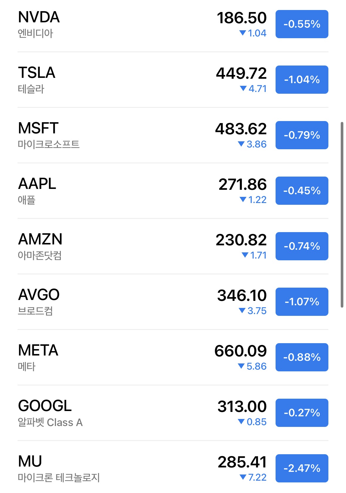 * 나스닥은 0.76% 하락으로 마감됨. 대부분의 종목이 1% 내외의 잔잔한 움직임으로 하락함. 마이크론 정도가 2.4% 하락하여 눈에 보이긴 함. 산타랠리는 없었고 차익실현 정도의 조정이라고 애써 해석하는 중.