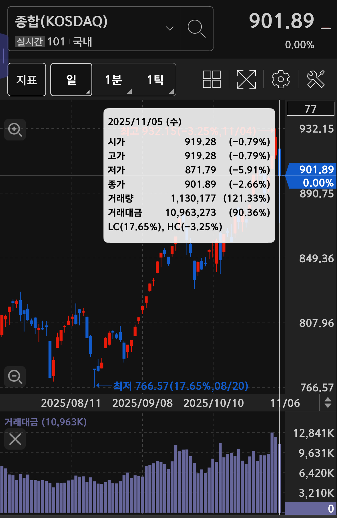 코스닥의 거래대금은 10.96조 가량으로 9.64% 줄어들며 강한 음봉에 아래 꼬리가 생김. 요즘은 코스닥이 더 긍정적인 모습인 듯.