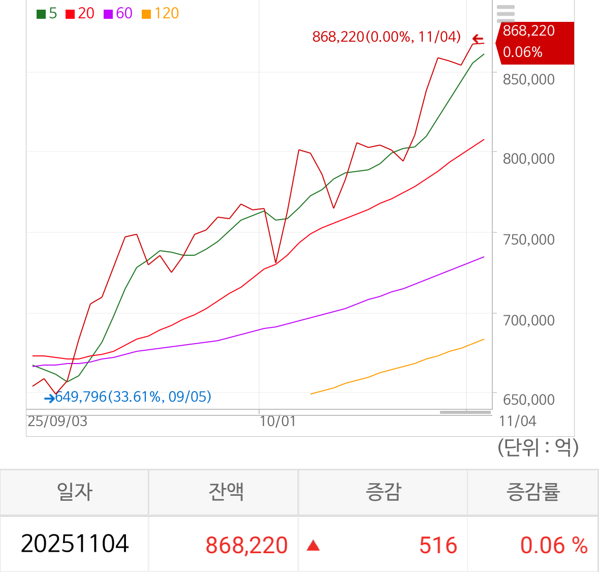* 고객예탁금은 86.8조 가량으로 0.06% 상승으로 잡히며 횡보하는 중. 이 날 버거형이 2조 날린 것을 생각하면 선방하고 있었음.