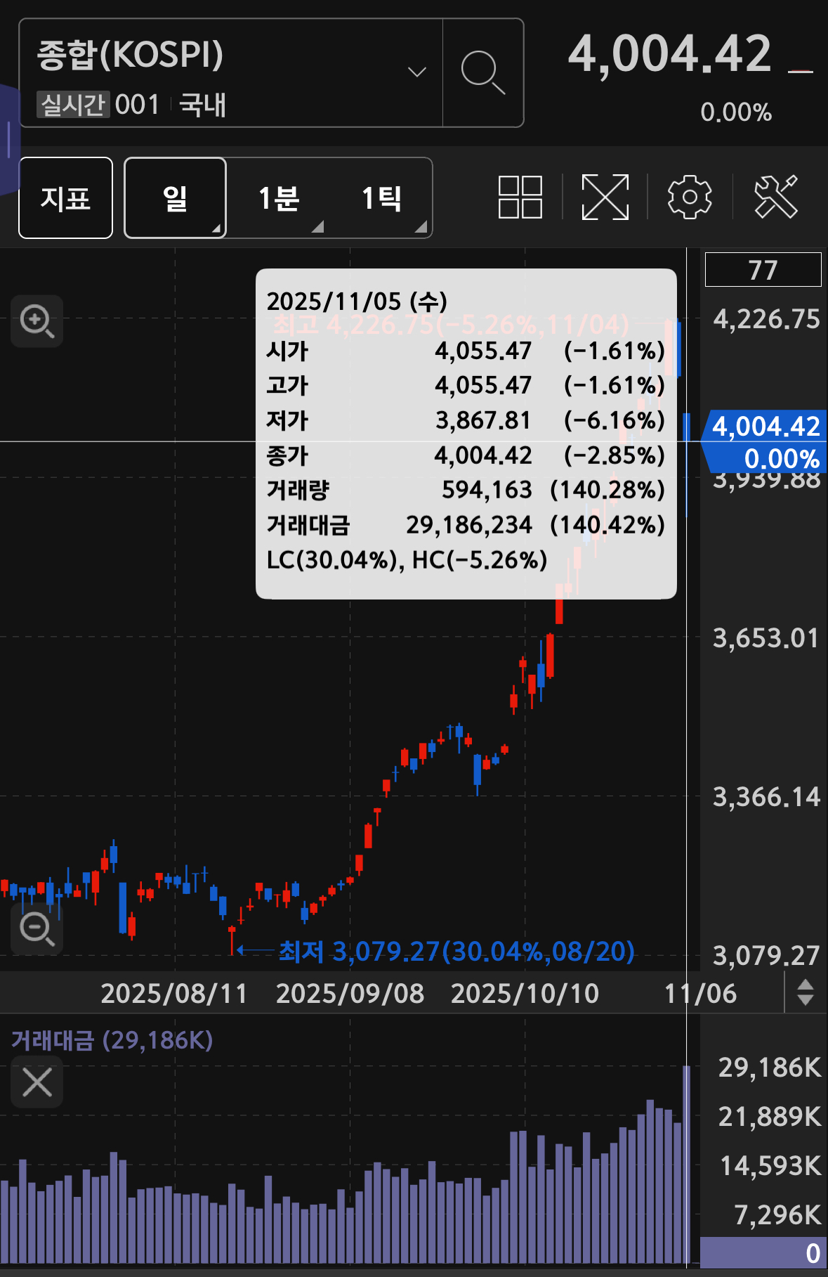 * 코스피의 거래대금은 29.2조 가량으로 40.42%나 늘어나며 강한 음봉을 찍었으나 아래 꼬리를 만들며 일부 회복해줌. 아직은 찐 하락은 아니라는 관점인듯.
