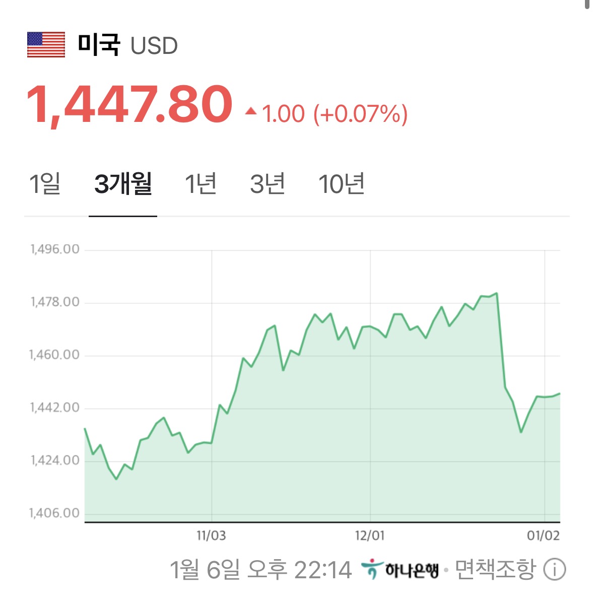 * 원/달러 환율은 서서히 오르기 시작함. 1,447원에 도착하였음.