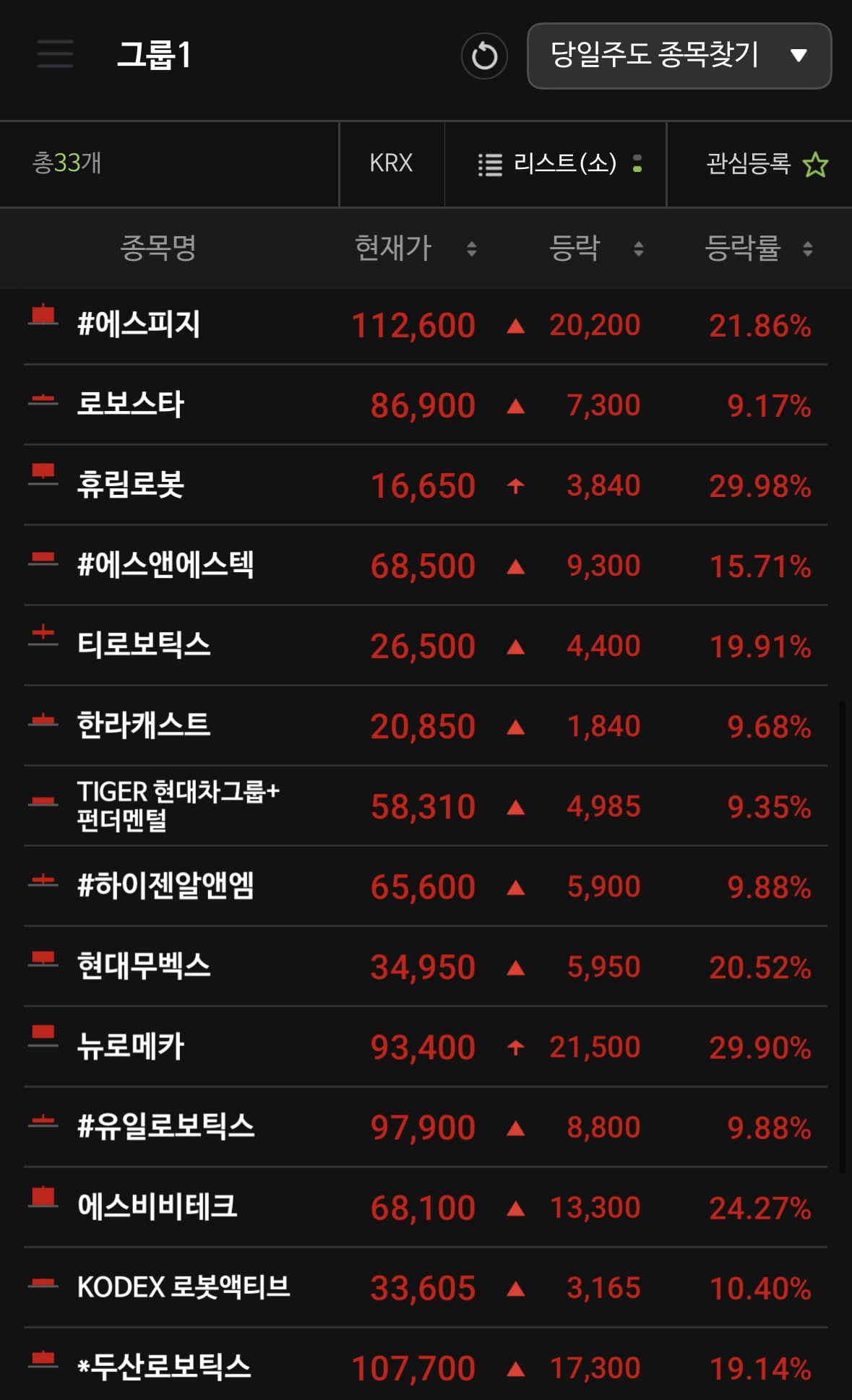 * 상승 이유: 정부의 로봇 산업 육성 정책 발표나 대기업(삼성, 현대차 등)의 로봇 관련 추가 투자/M&A 소식이 모멘텀이 된 경우가 많습니다. 특히 휴림로봇, 뉴로메카, 우리기술 등이 상한가 혹은 그에 준하는 급등을 기록한 것은 특정 기술력 인정이나 대규모 공급 계약 체결 소식이 반영된 결과로 풀이됩니다.