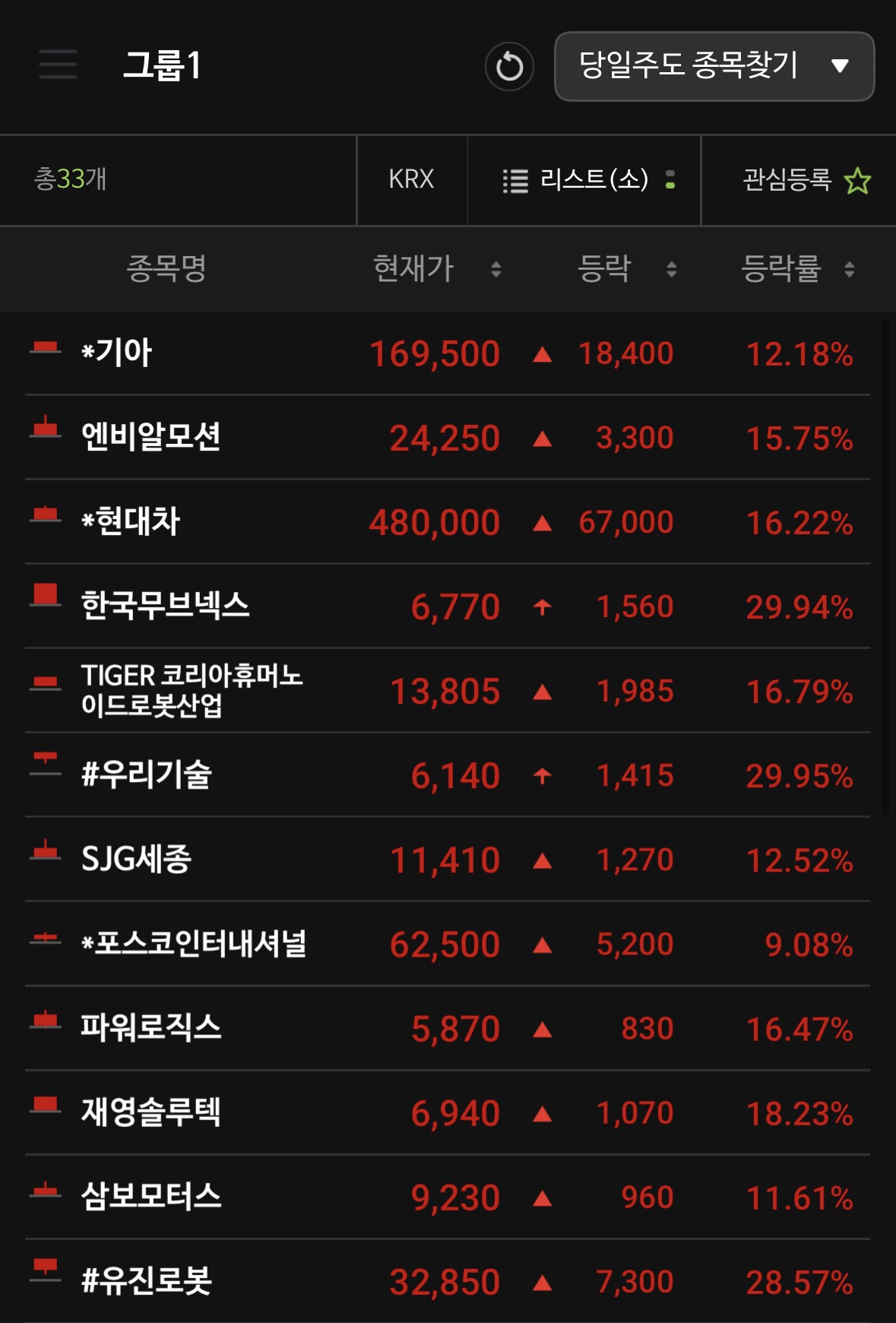 오늘의 주도 종목들을 분석한 결과, 주로 로봇, 자동차(부품), 그리고 2차전지 섹터가 강력한 상승 흐름을 보였습니다.