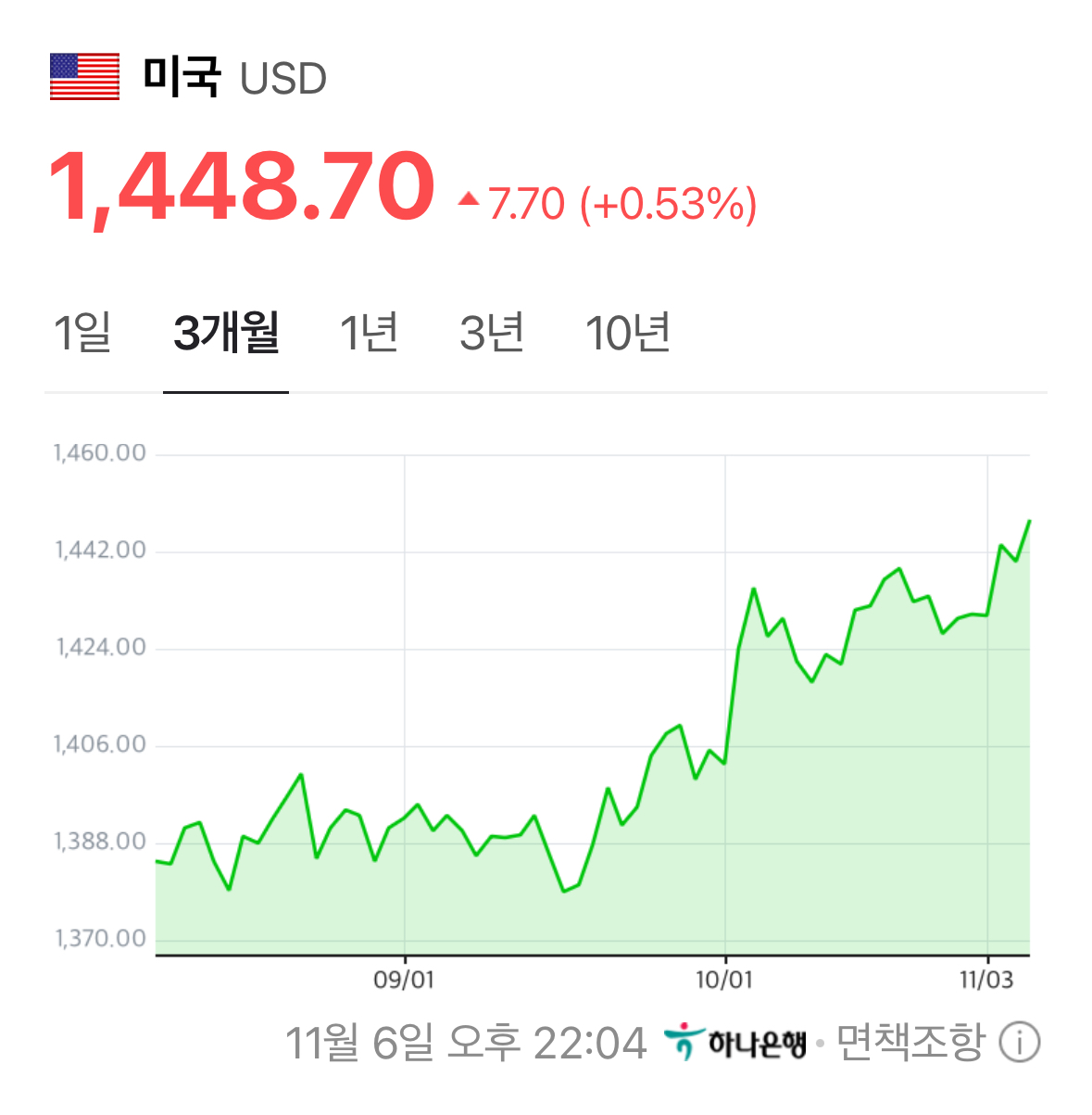 * 원/달러 환율은 점점 늘어나고 있음. 버거형들이 국장을 매섭게 탈출하다보니 달러가 부족해지고 있는 듯. 1,448원으로 3개월내 최고가를 기록하며 더 위를 바라보고 있음.