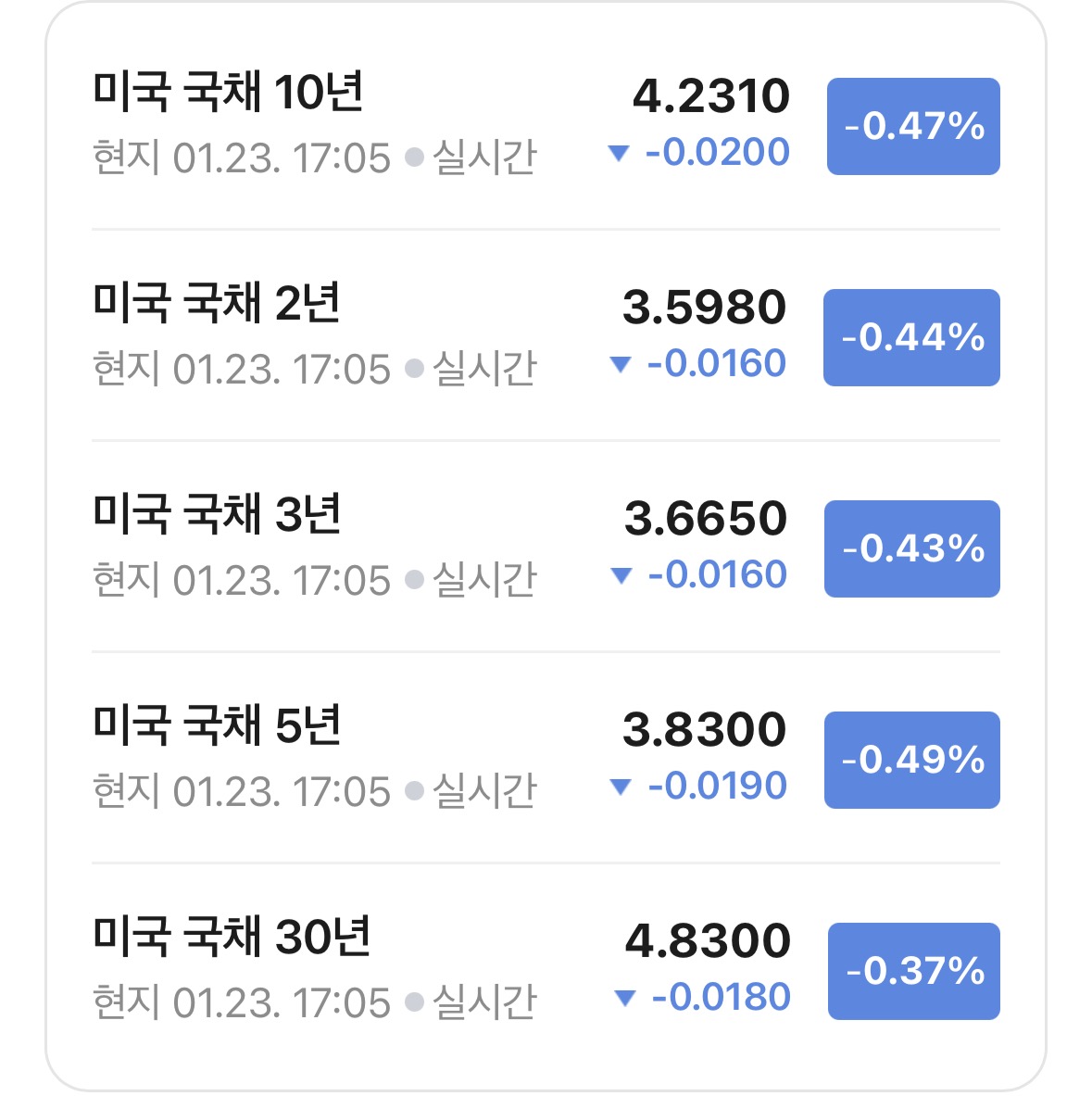 • 10년물: 4.23% (-0.47%)