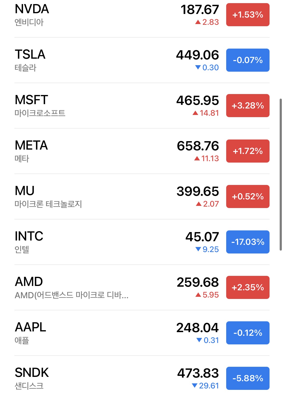그동안 많이 올랐던 샌디스크 역시 약 -5.8% 조정을 받으며 차익 실현 압박이 거셌다.